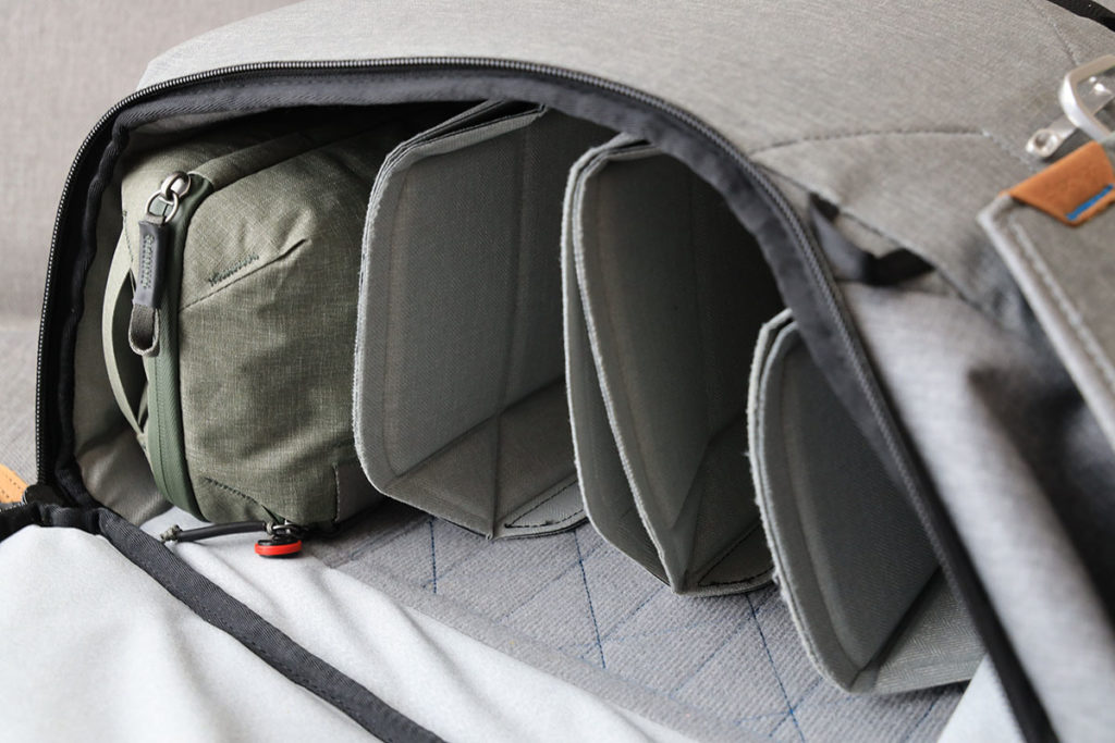 Peak Design製品の仲間なので、細かいパーツ、ガジェット類がお互いにぶつかって傷つかないための仕切りが満載。内装はそれこそアッシュ。この色で外装も作ってくれれば良かったのに、なんで同社のほかの製品と違うカラーリングにしたんだろう?
