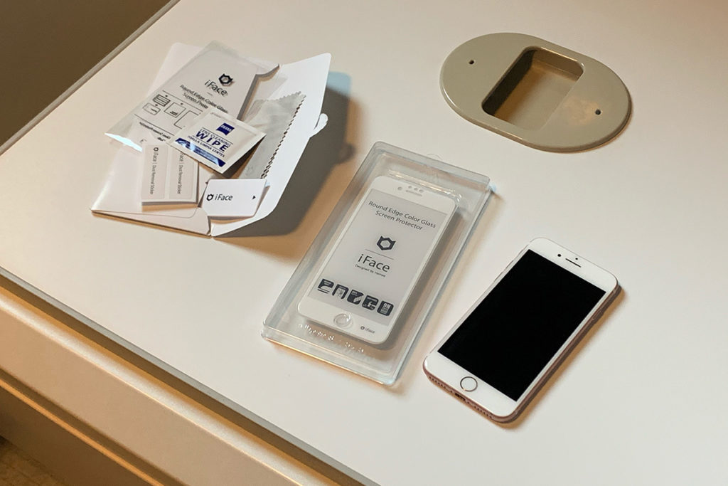 例によってクリーンルームで作業。iFaceは貼り付けに必要な装備品が全部入っているので、特に道具を準備しなくても簡単交換。ちょっと気泡が抜けにくいのが難点ですが、エア抜きへらも付属しているし、そこは根性で。