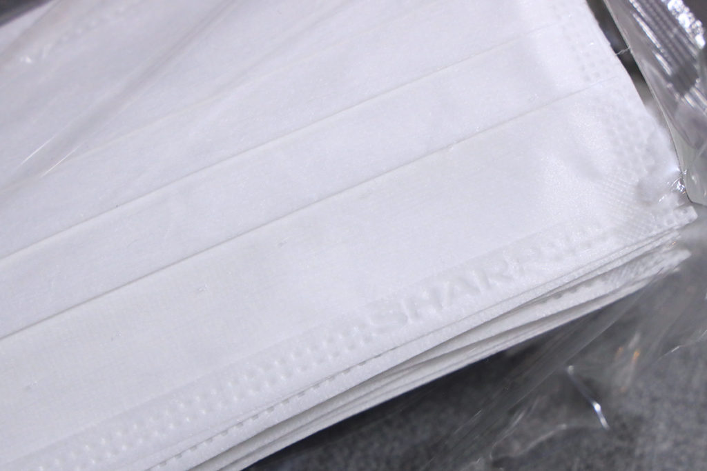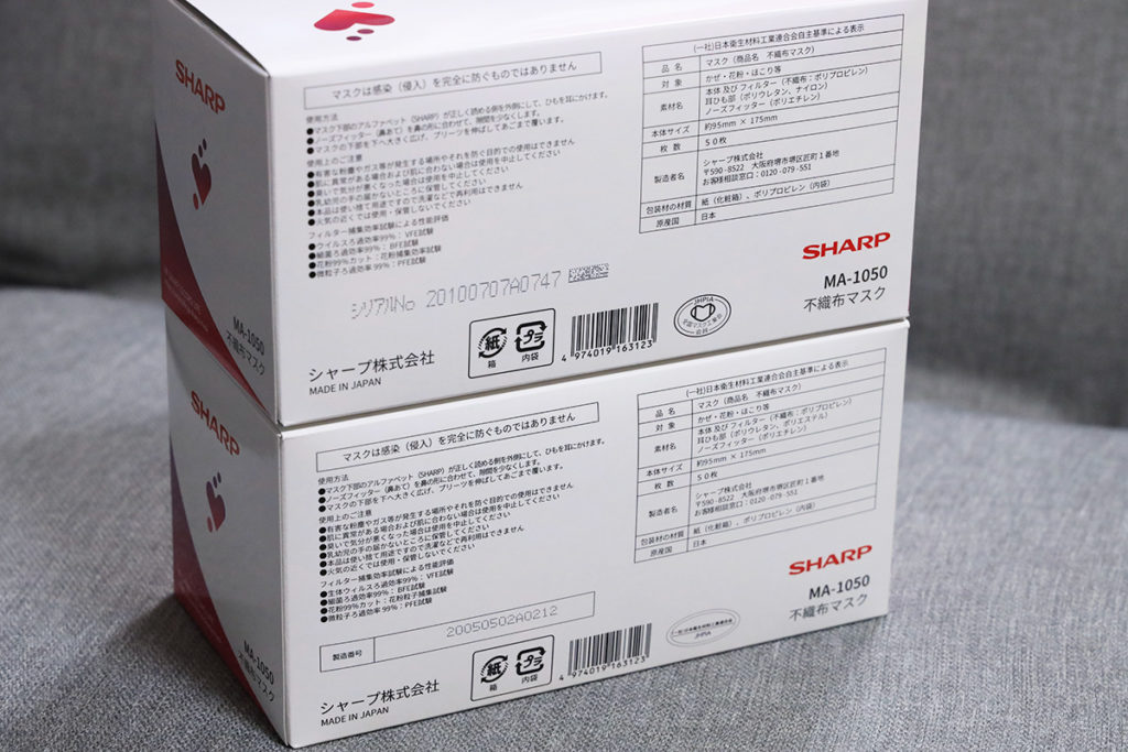 裏面は微妙に異なります。上が新しい方。シャープは日本マスク工業会に加入したんですね…(笑。