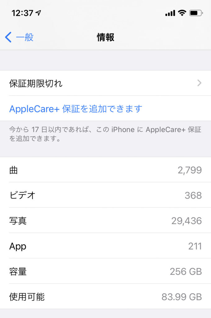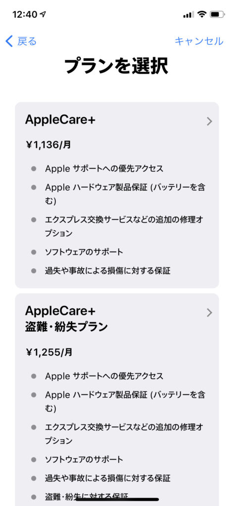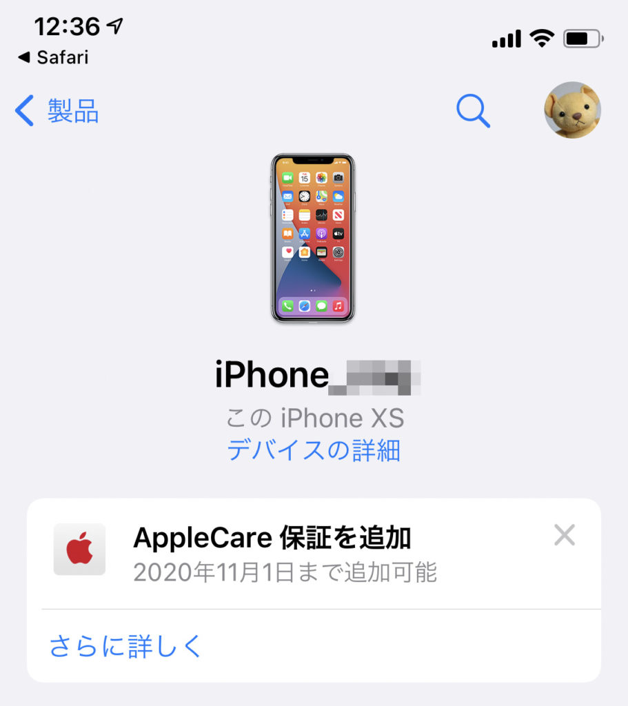 ここの「AppleCare+ 保証を追加できます」表示で気がついたんですね。タップすると、