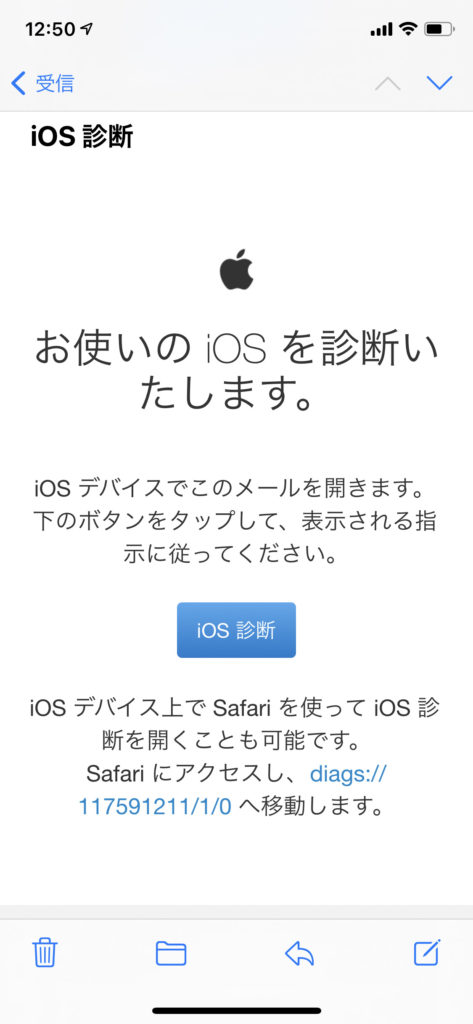 仕方がないのでMacの方から申し込んでみたところ、「iPhoneに診断プログラムへのリンクを送るからiPhoneで受信可能なメアドを入れろ」と出たので、入力、送信。するとiPhone側でメールのリンクに従い診断プログラムが起動します。