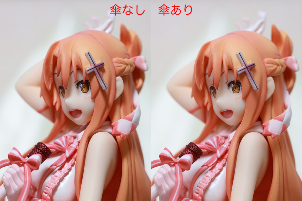 これはLEDシーリングライトの光だけで撮影したものですが、左が特に対策なし、右がシーリングライトの光が直射されないように遮る形で傘を置いたものです。写真に詳しい方には説明不要かと想いますが、こんな感じで光がマイルドになります。完全に不透明な傘と比べて、極端に暗くならない(ISOが高くなったり、シャッター速度が遅くなったりしない)のが特徴です。