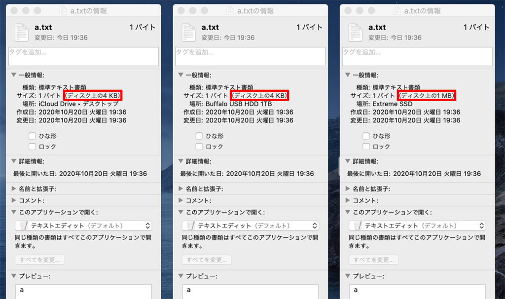 これが1MBだと、無駄になる記憶領域は1MB×20万×0.5(平均)=100GBになります。必要な保存容量は5MB×20万+0.1GBで、ほぼ1.1TBです。10%も多く消費する計算になります。