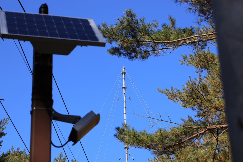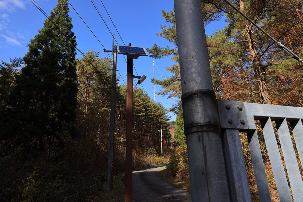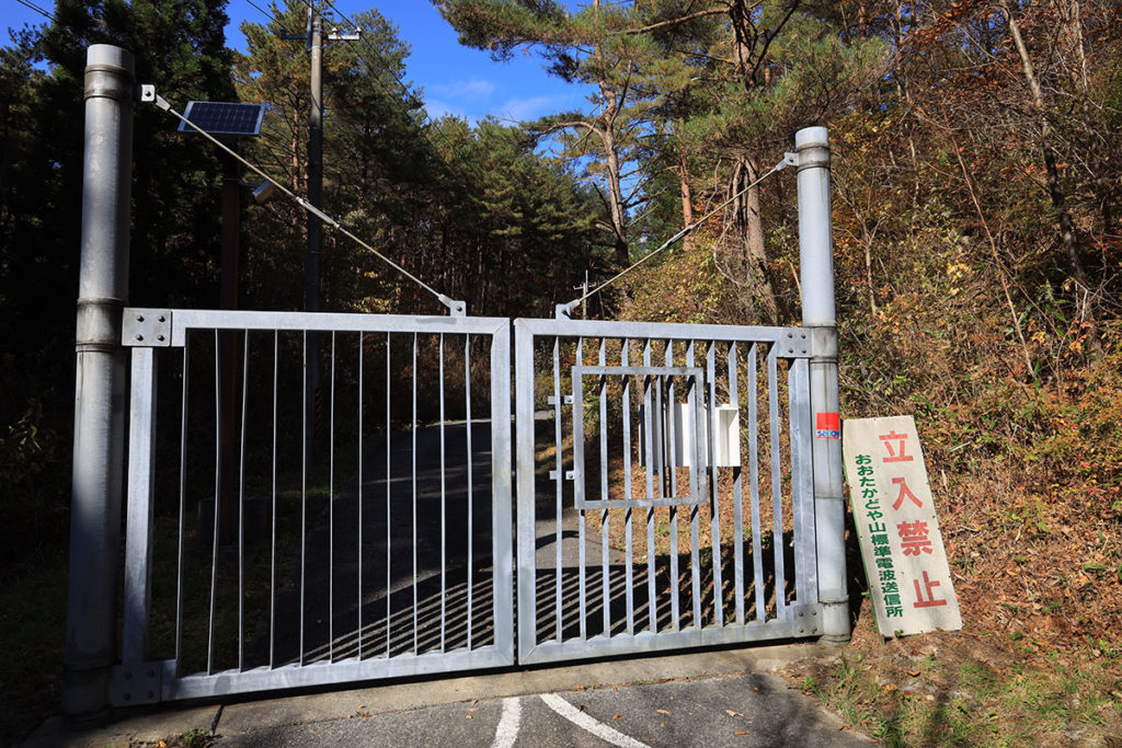 中へは入れませんが、立ち入り禁止のゲートの前からでもアンテナを確認できます。高さは250mあるそうです。東京タワーの第二展望台の高さですね。この山自体が標高790mあるそうなので、アンテナのてっぺんは海抜1,040mということになり、スカイツリーより高いことになります。但しアンテナ自体は細いため、あまり圧迫感はありません。