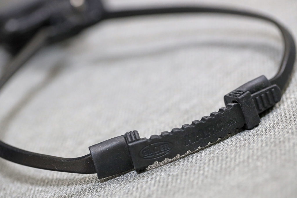 この首の後ろに回る部品がソフトアジャスターで、標準品はこの部品がありません。これがあることで多少外れにくくもなりますので、トレッキングではいい感じではないかと思います。