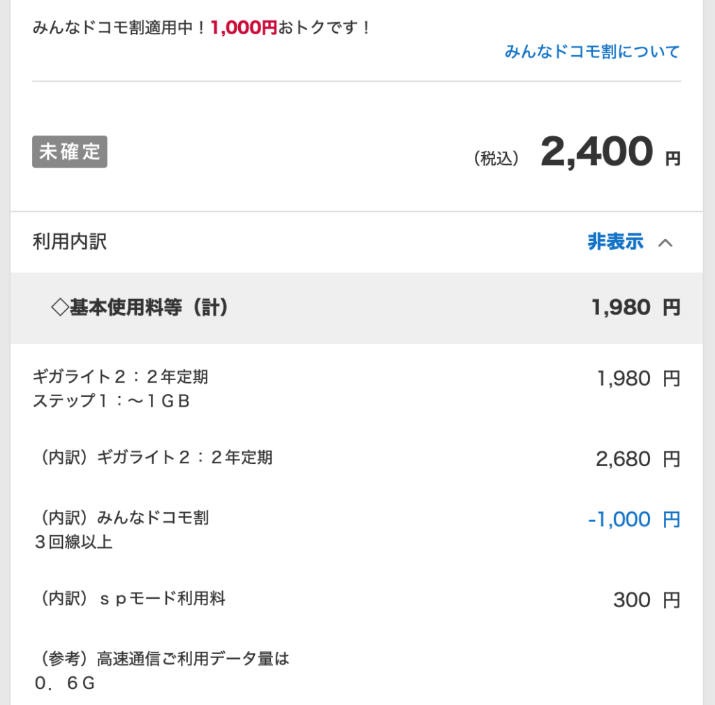 あれ?ドコモ光セット割は?…と25.6秒ほど考えましたが、「ステップ1:〜1GB」ではドコモ光セット割りはないんですね。1GB以上になると500円、3GB以上で1,000円の割引があります。なので、現時点ではこの表示で正常です。