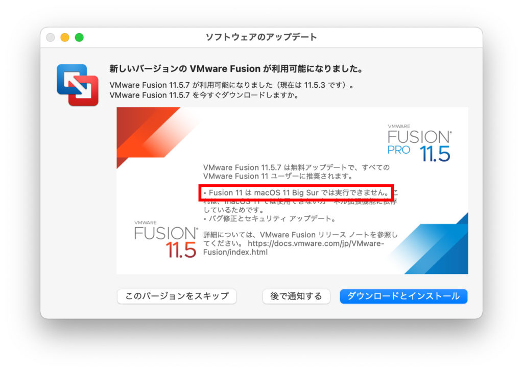 macOS Big Surにしたところ、VMWare Fusion 11 が起動できなくなりました。