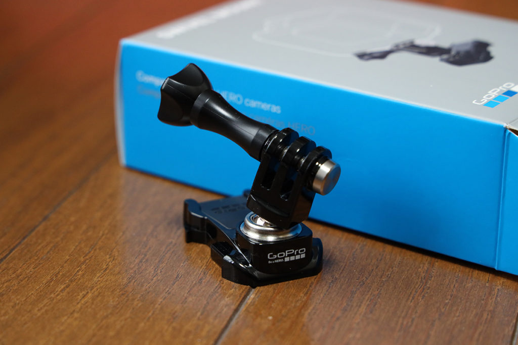 これはサクションカップなど固定の方向が制限されるものを使うときに必需品のようなもので、よく今までこれを買わずにGoPro使ってたな、と自分で不思議になるほどです。たとえば自動車のサイドガラス(合法的には内側)にサクションカップを貼り付ける際、これがないと完全に前方か完全に側方しか向けませんが、これがあると斜め前方の撮影が可能になります。