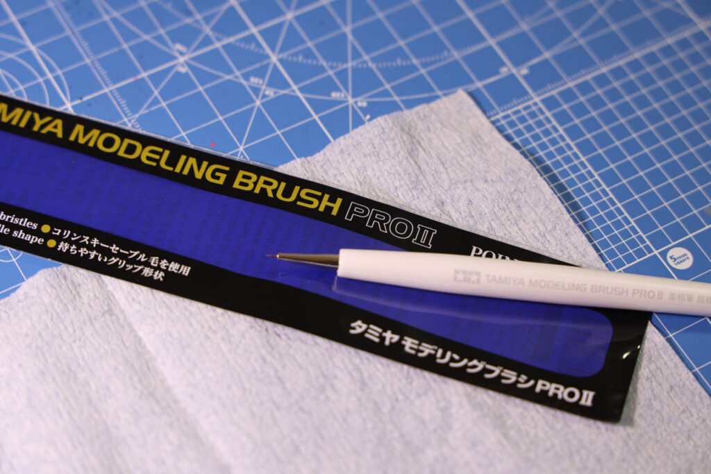 タミヤのモデリングブラシPRO II 超極細面相筆です。同社のハイエンド筆ですが、実売900円ほどで買えます。高級品ですが所詮工業製品なので、芸術品的要素がある書道の筆に比べたら安いものです(笑。