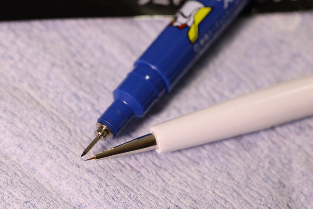 ガンダムマーカースミ入れ用より全然細い。1/144ガンダムの目を塗るのも本当に筆を何往復もさせないと塗れないほど細いです。たまにフィギュア作例(特にガンプラに付属するパイロットのフィギュア)なんかですごい細かいところを筆で塗り分けているのを見かけますが、なるほど皆さん、こういうのを使ってたんですね。あとは自分の手の震えとの戦いですが、そこを克服して塗り分けるのもまた楽しい。