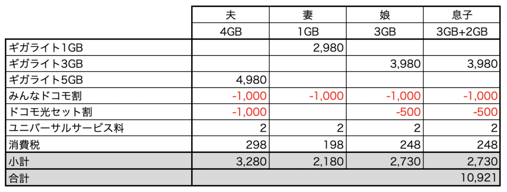 ツマのパケット使用量は1GB/月以下なので、税込み2,178円。ドコモの(子供とシルバーおよびMVNOを除く)スマホ向けプランでは最安になろうかと思います。ファミリー間音声通話が多いので、ahamoとかMVNOは考えていません。