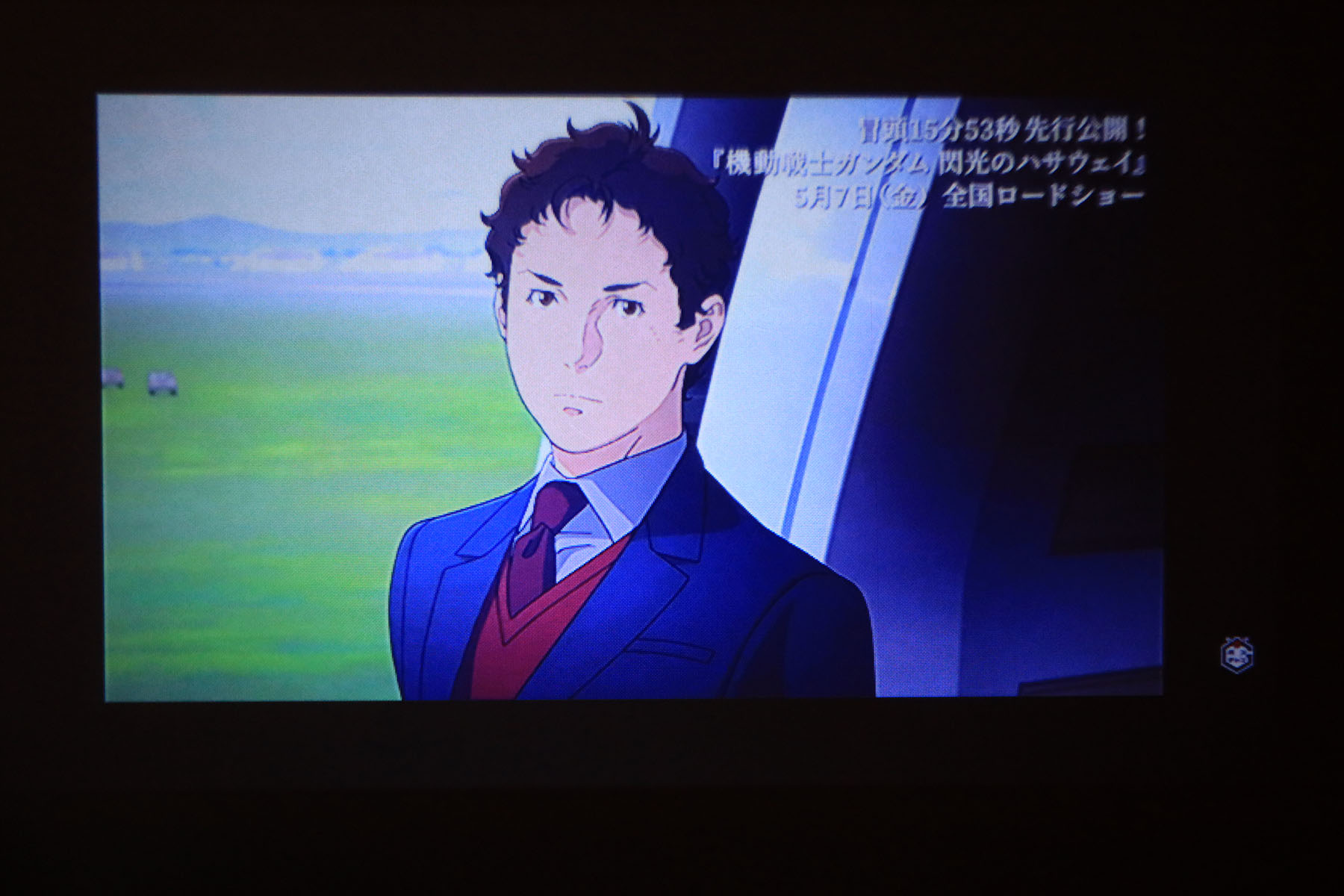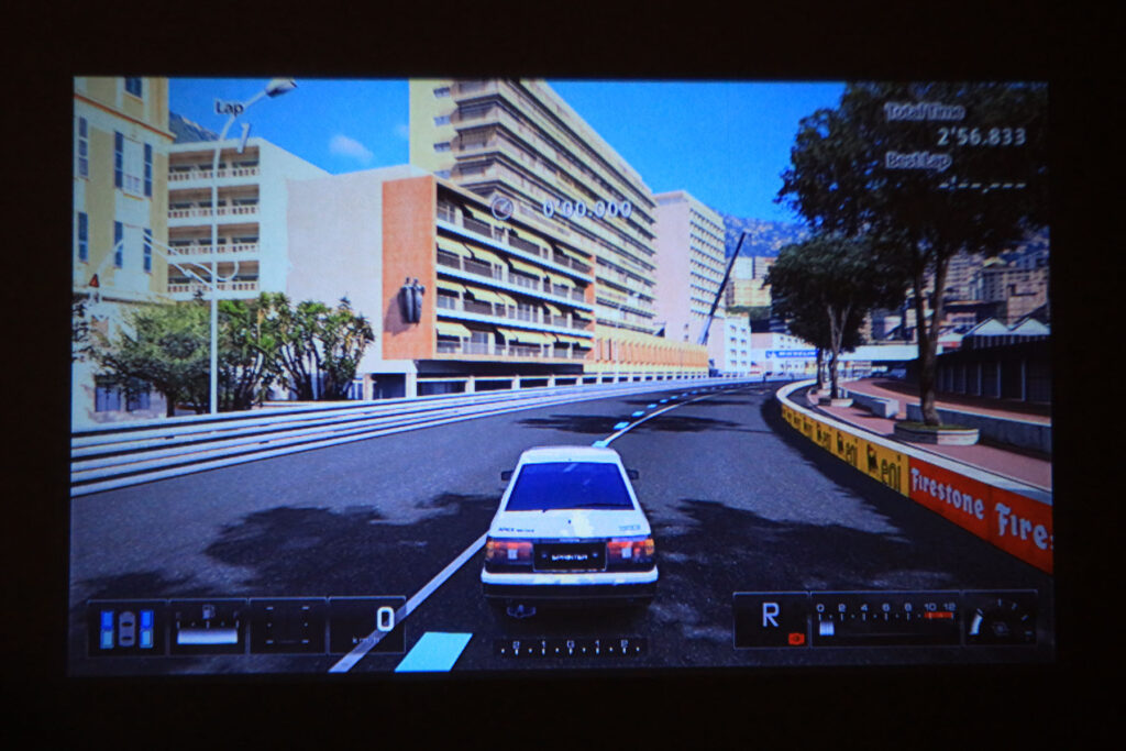 PS3を繋いでみたところ。ちょっと画面端部の文字は判読が厳しい感じです。スペック的には720P(おそらく1280×720画素)あるようなのですが、レンズの性能で画面中央部と画面端部に同時にピント合わせすることができません。ただ、SD解像度とHD解像度の判別はつきます。