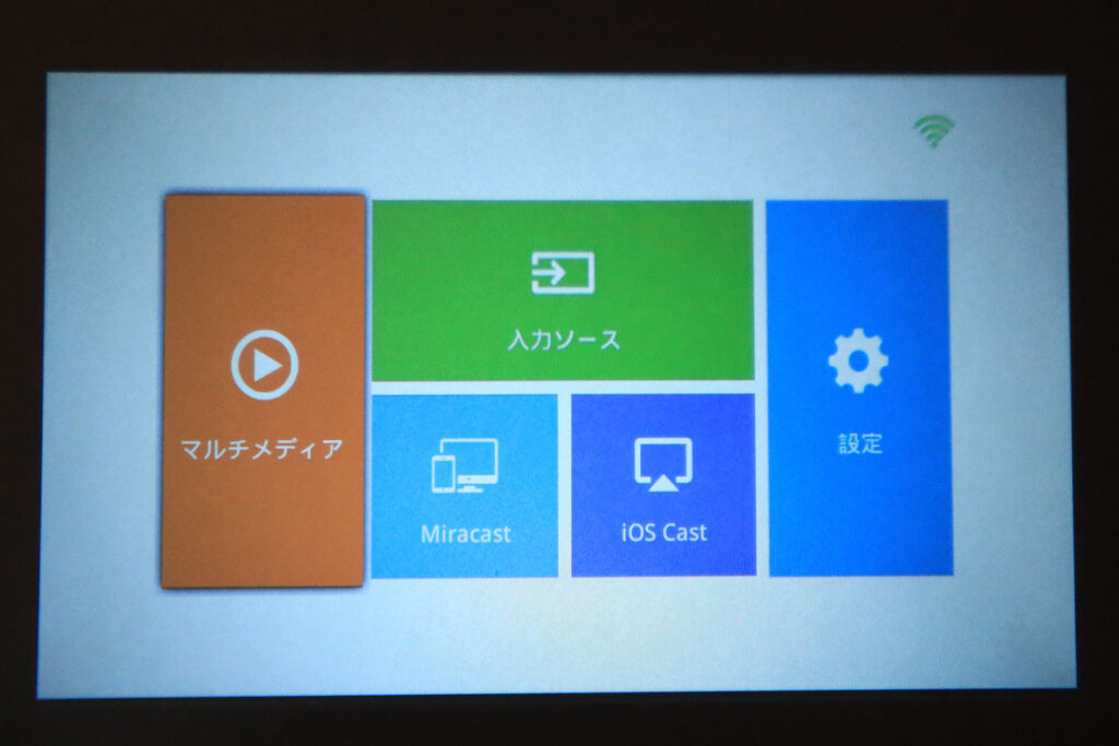 映してみます。これはホーム画面。この前に初回電源投入時にWi-Fiをスキャンする機能が働くのですが、それで宅内のWi-Fiルータに接続します。すると宅内にある他の機器(スマホなど)からWi-Fiで映像を出すことができます。