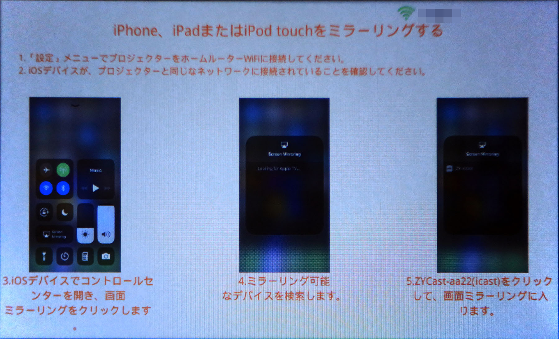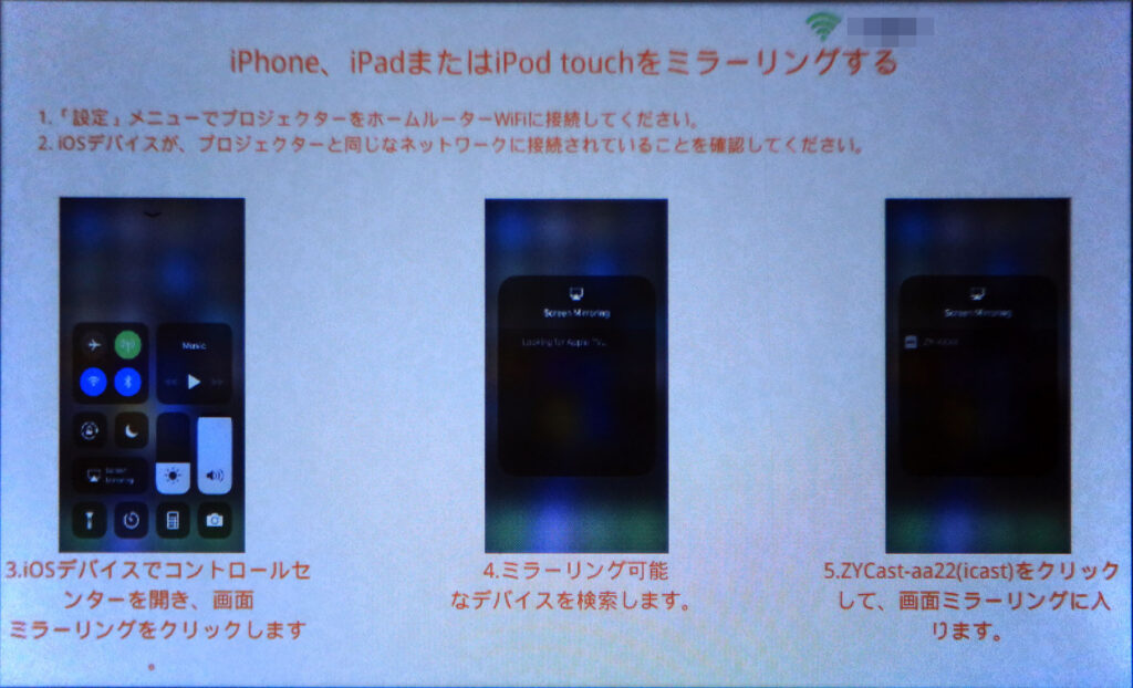 ただ、iPhoneからのミラーリングをすると、画面が一回り小さく表示されます。上の写真で赤く囲ったところがこのプロジェクタの投射エリアです(赤線は説明用のもので、実際は表示されません)。キッチリ表示するためにはミラーリングではなくプロジェクタ以内のプレイヤーアプリを利用する必要があるのだと思いますが、これがどうやってもうまく動かず。クルクルアイコンのまま先に進みません。