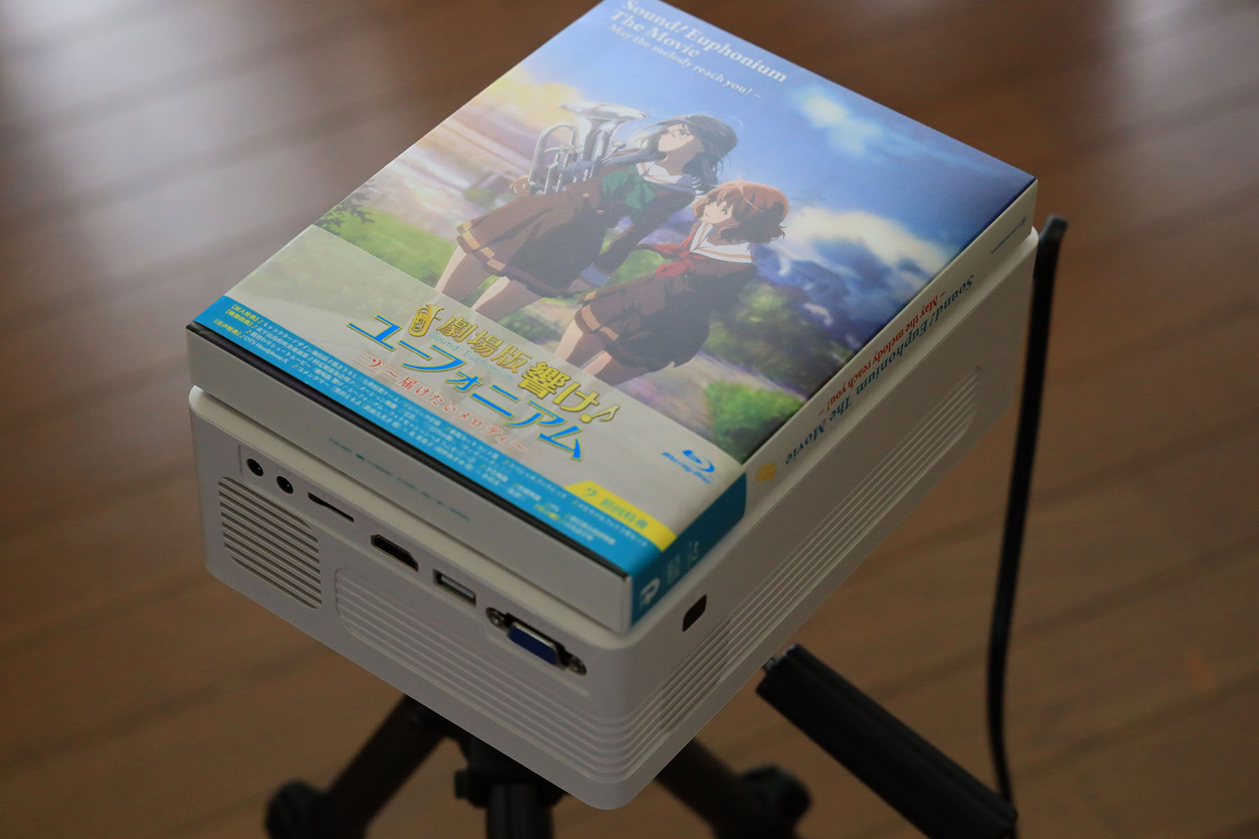 会社でよく見るプロジェクタより、二回りは小さいです。光源がLEDになった効果ですね。しかし三脚ネジ部が底面で凸部になっているせいで三脚との接触面積が極小で、雲台に対して水平が出ません。雲台で適宜水平を出してやる必要があります。