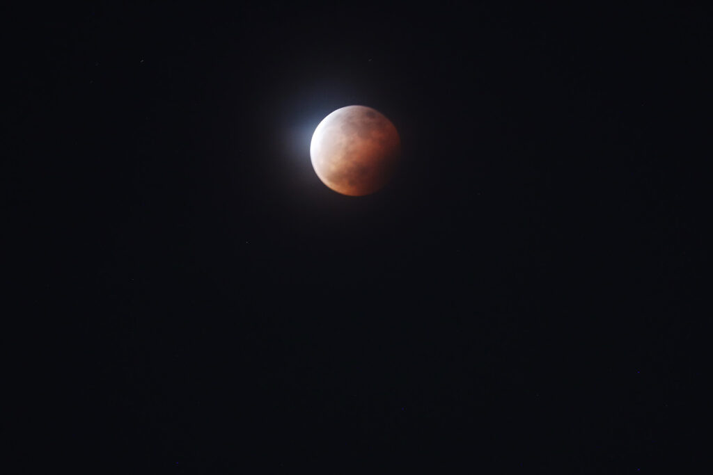 EOS RをAPS-Cモードにして、普及価格帯ズームで撮影したものです。三脚使用。左上の白いのが太陽からの直射光で照らされている部分、右下に従って赤くなるのは地球の大気を経由して赤くなった(夕焼けの原理と同じ)光で照らされた部分です。撮影時刻は20:26で完全に食に入っているはずなので、左上の白いのは単に明るいだけかも知れません。