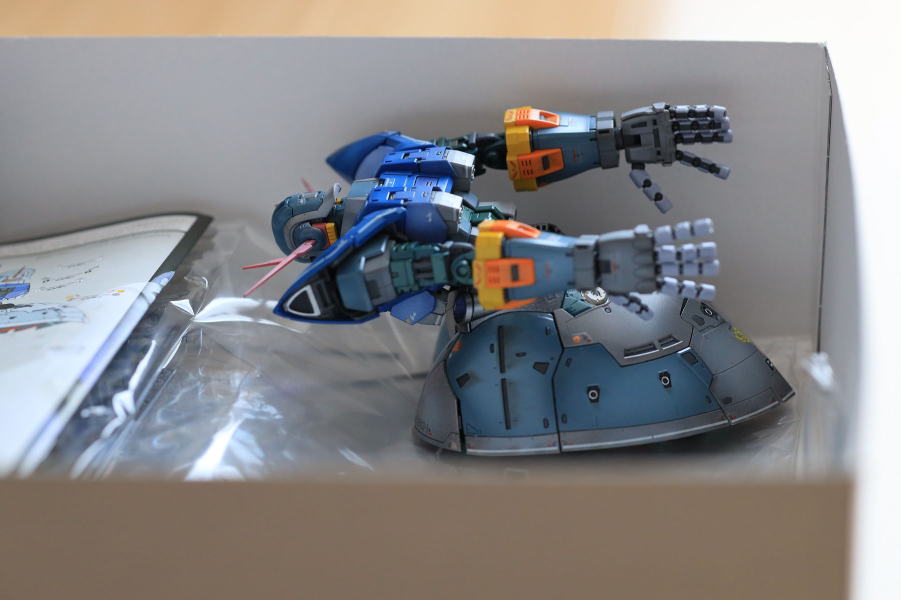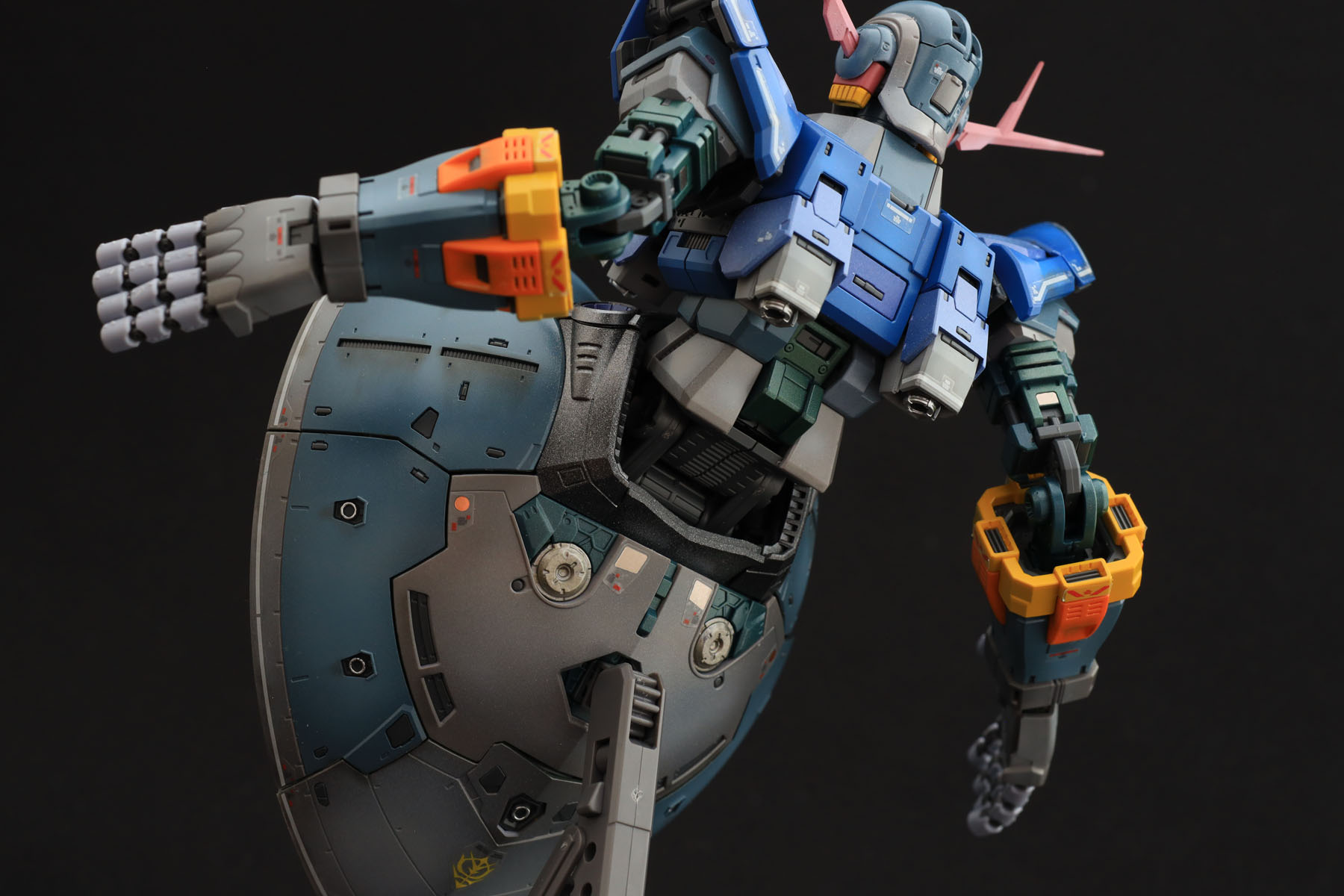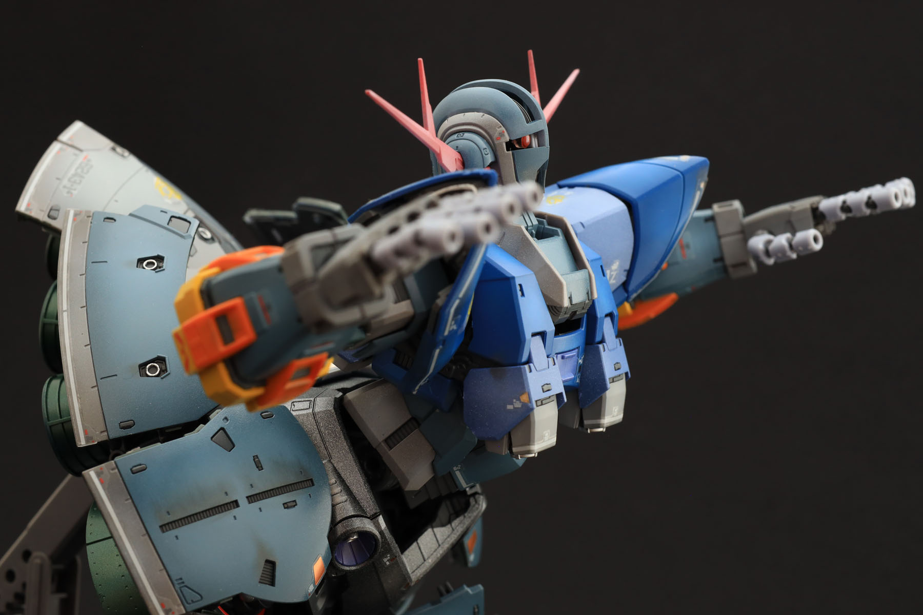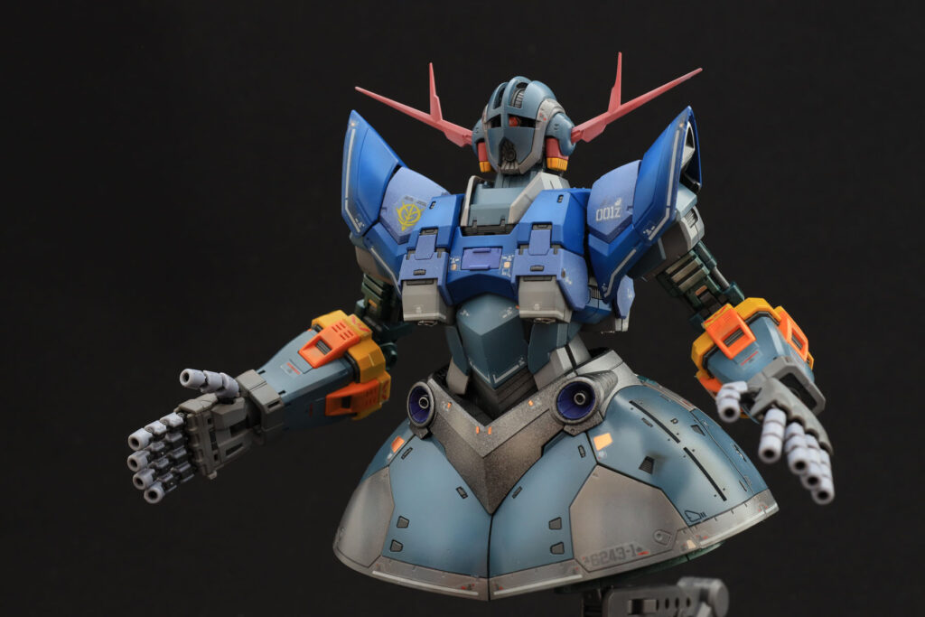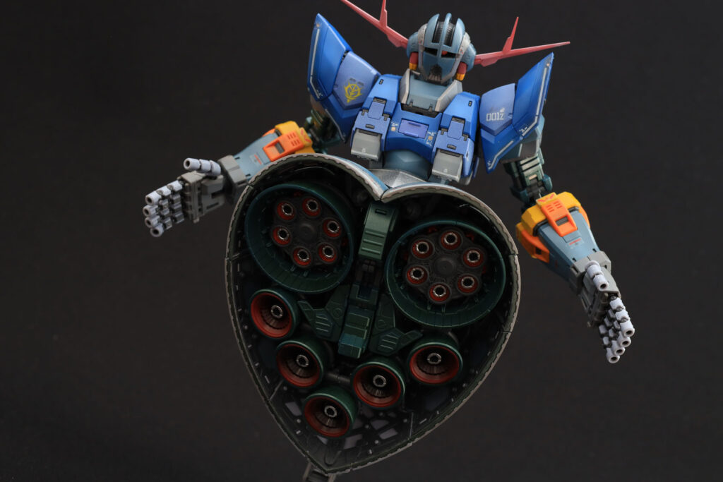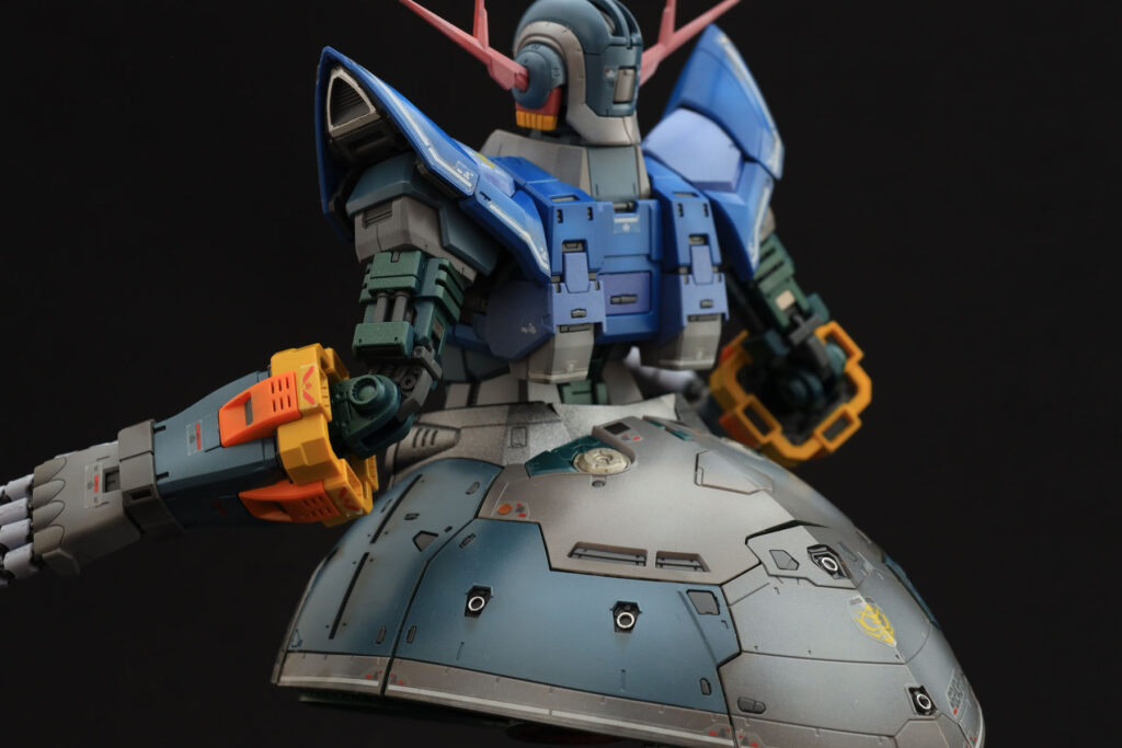 ただ、ほぼ全塗装となると難しいのが、全体のトーンの統一ですね。胸から肩にかけての青はもう少しくすんだ感じでも良かったでしょうし、頭部の赤いアンテナは最初もう少し鮮やかな赤に一度は塗ってみたのですがどうも色調が浮いてしまい現在の色に塗り直しました。