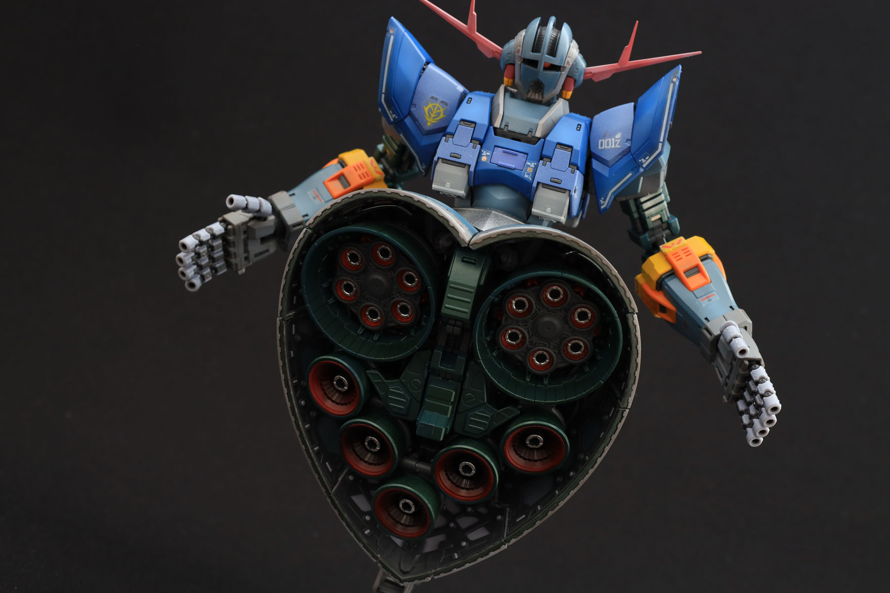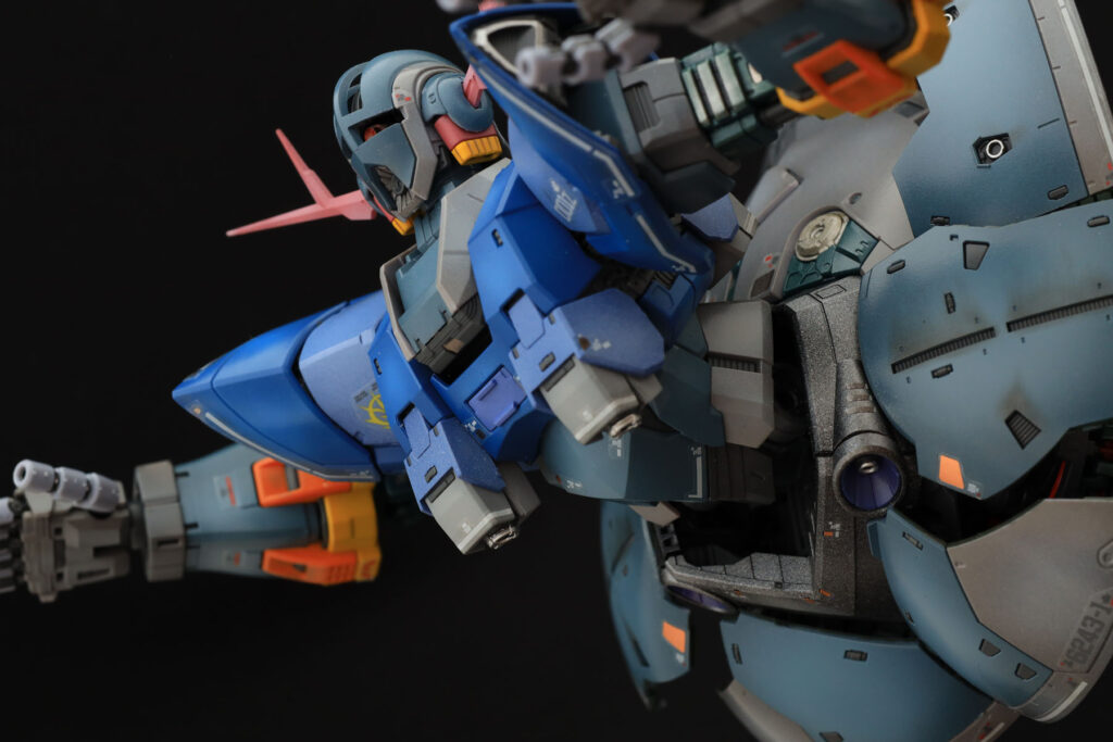 モノアイは顔を向けた方に連動して動きます。硬くてアイデア倒れということもなく、スムースに動きます。わかりにくいかも知れませんが、モノアイはシールではなく塗装で、ハイライトも入れてみました。