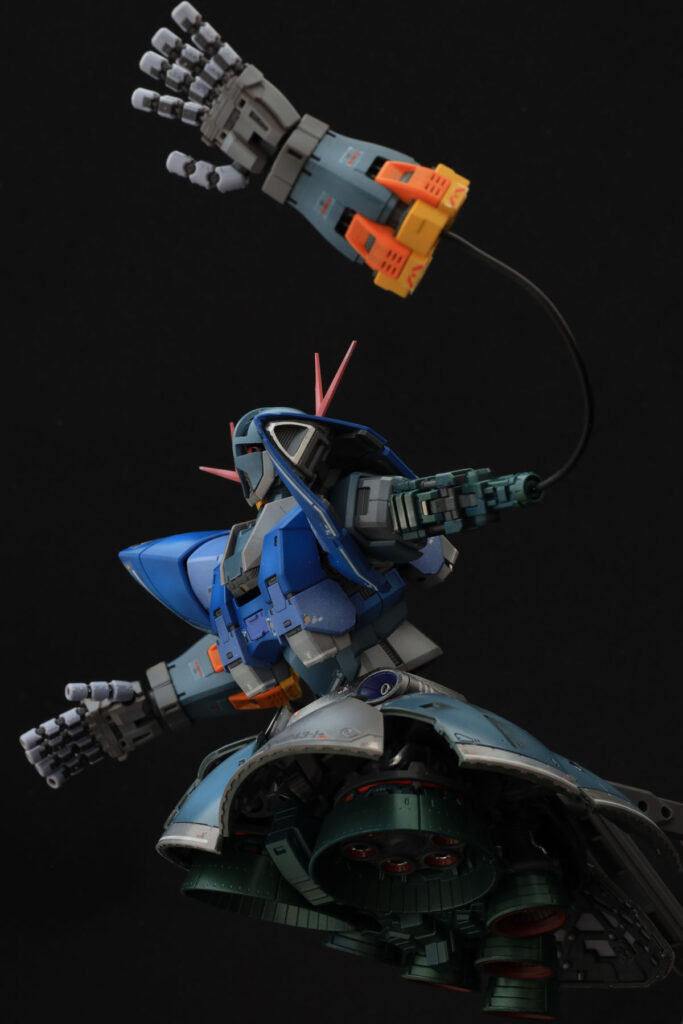 現代流の解釈が与えられたジオングは、びっくりするほど腰が曲がります。この腰の曲がりによって…