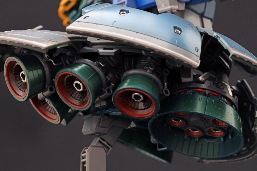 スカートが分割可動するのも現代の新解釈。スカート底面側エッジ部分の塗り分けは一見大変そうですがモールドがはっきりしているため意外と楽でした。塗り分けにはガンダムマーカーのジオン系グリーンを使いました。ここを塗り分けるとスケール感が出るのではないかと思います。