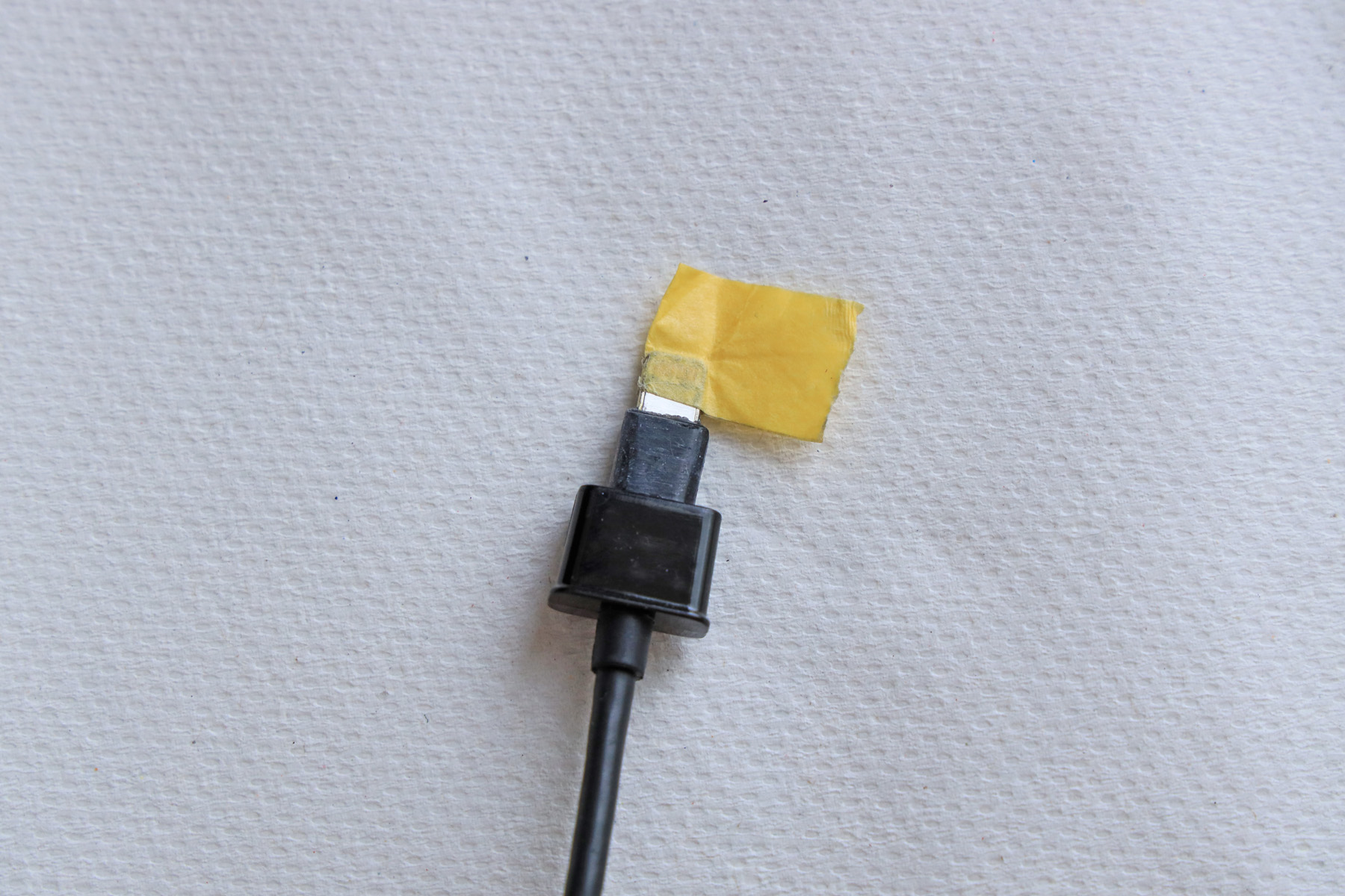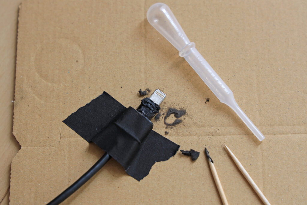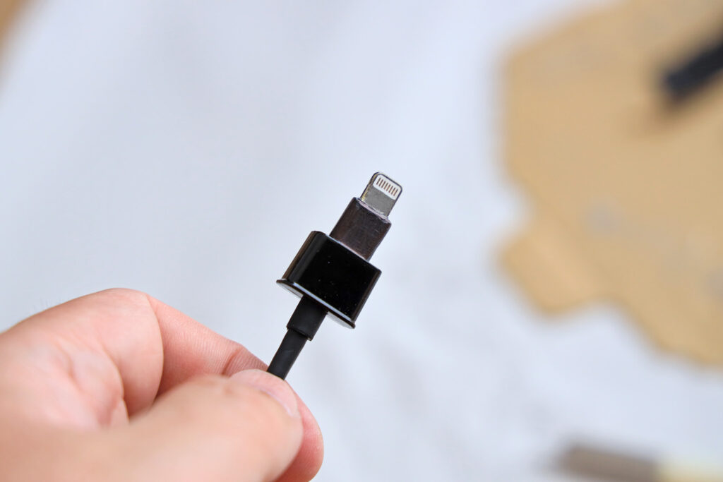これを使って直したかったのはこれ。クルマで使っているLightning延長ケーブルです。充電だけの延長ケーブルは安いですが、音声データや曲名データもちゃんと伝送できる延長ケーブルはこれが唯一です。アウディ純正のLightningケーブルが短すぎて使いにくいのでこれで延長して使っていたのですが、いつの間にか砕けていました。ちょっとコネクタ部分がグラグラします。買い直すにも結構いい値段がするケーブルなので、断線していないので修理することに。