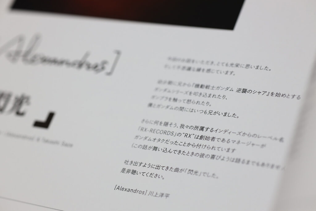 RX-78といえば閃光のハサウェイのテーマソングを歌う [Alexandros] のレーベル「RX-RECORDS」は、ガンダムのRXに由来しているのだそうです。閃ハサを担当する前からの話なので、これはガチなやつですね。