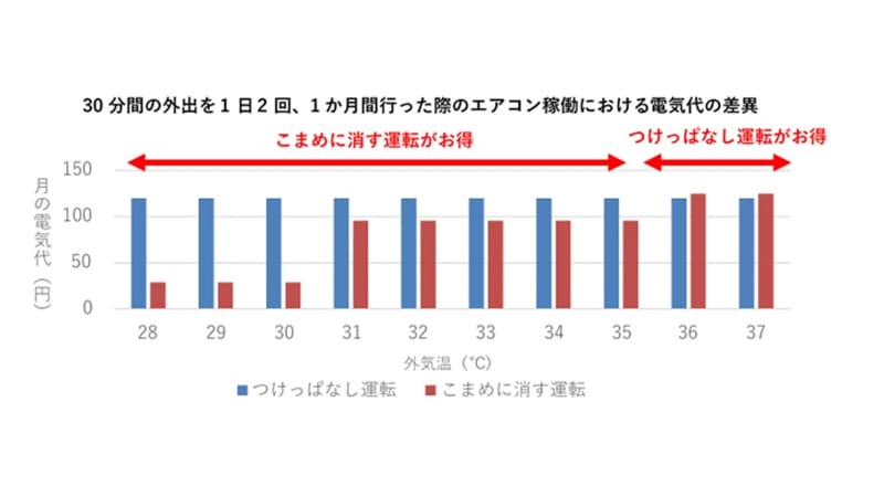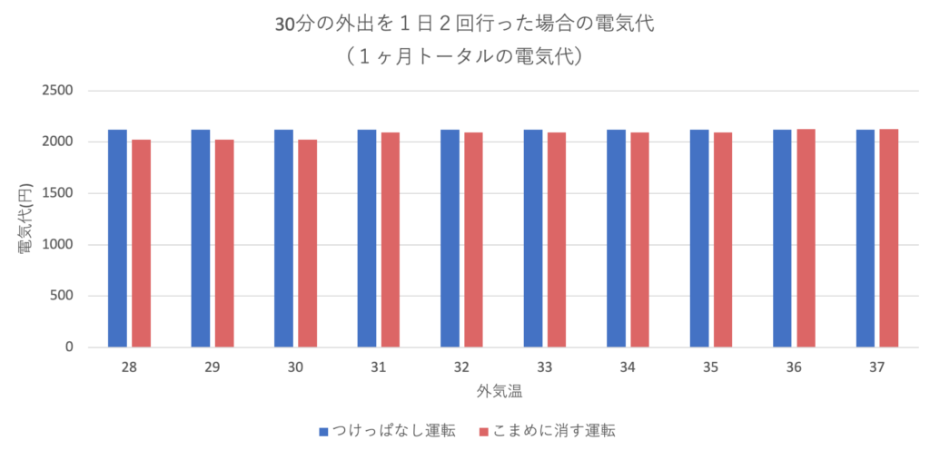 パナソニックからの回答によると、これは「1日30分×2回×1ヶ月」の外出に起因する部分だけの料金の比較とのことです。すなわち、青グラフは「1日30分×2回×1ヶ月だけつけっぱなしの電気料金」であり、赤グラフは「外出により室温が上昇した状態から設定温度(今回は26℃)に戻るまでに余計にかかった電気料金」とのことでした。