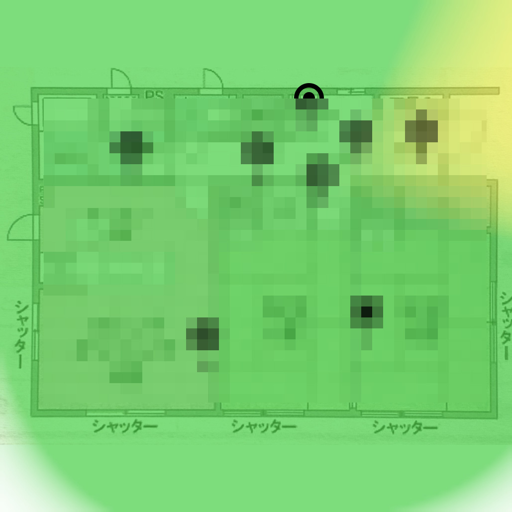 設定完了後、片方を一階に、もう片方を二階に設置。そして IO DATAが配布するiPhoneアプリ「Wi-Fiミレル」を使って、ヒートマップを作ってみました。