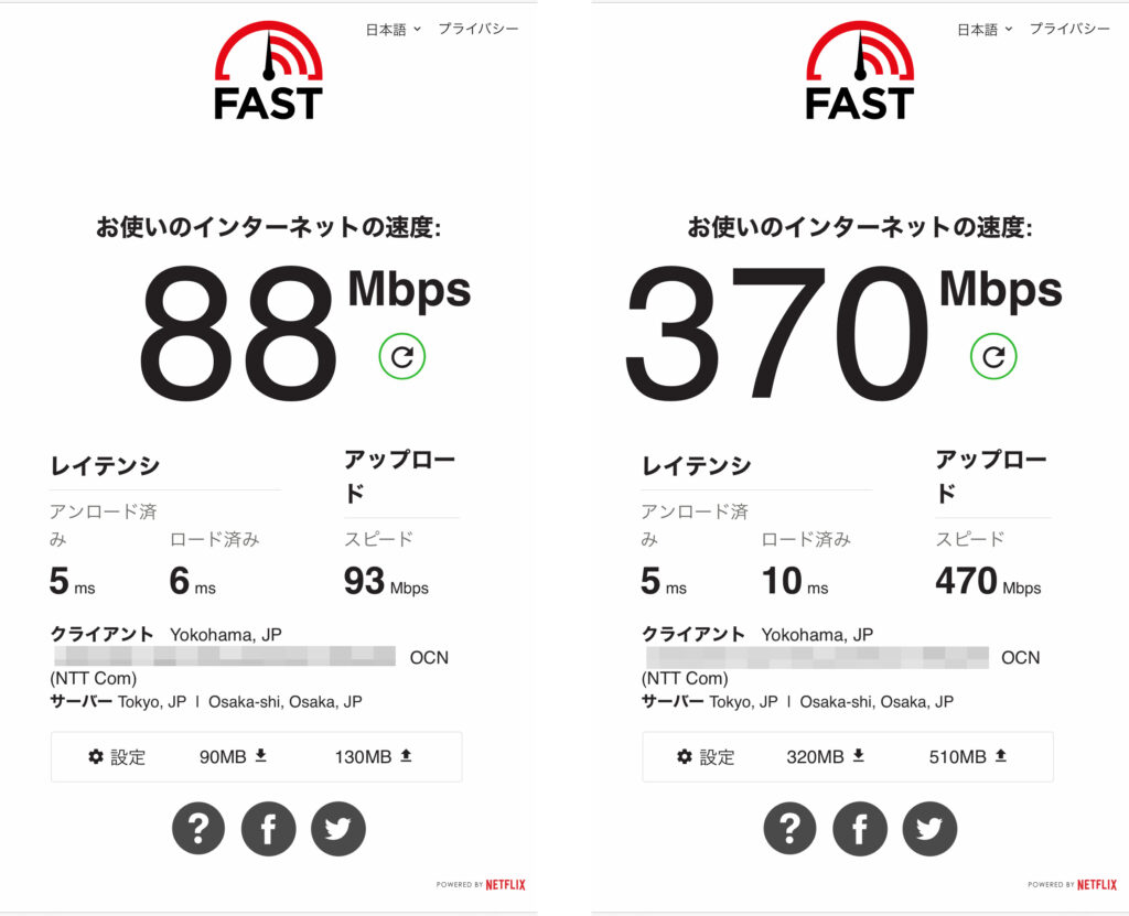 そして何より、大幅な速度アップ。一階の家の真ん中あたりで測定した結果、AirMac Time Capsule での速度(左)に対して、VELOPでの速度(右)。廉価なデュアルバンドモデルでも2017年のAirmac Time Capsule よりこれだけ速いのですから、進化の過程の無線LAN機器は高いのを長く使うのではなく、安いのをこまめに買い換えた方がいいですね。