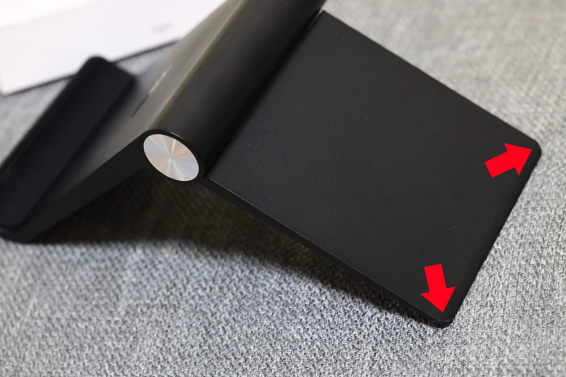 機構がシンプルなのでELECOMほどフラットにはならないのですが、正面から見ると真っ黒なので横画面で動画視聴時にスタンドの色に気を持って行かれる事がなく、なかなかグッドでした。