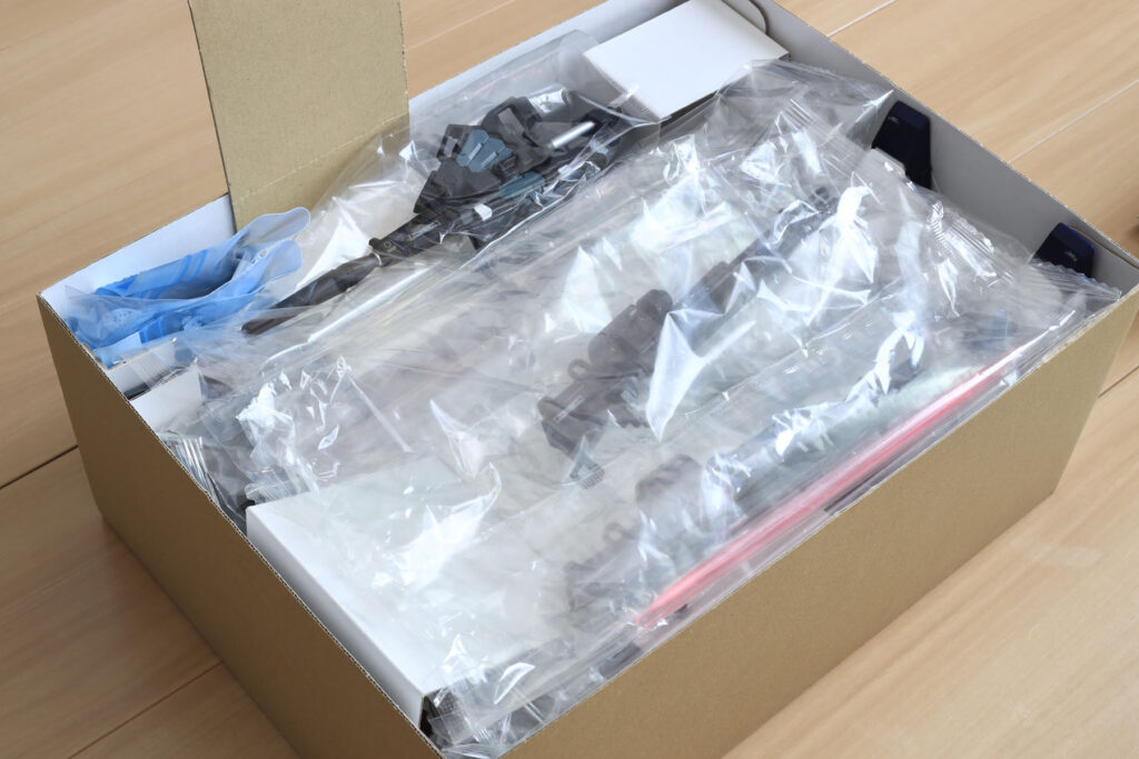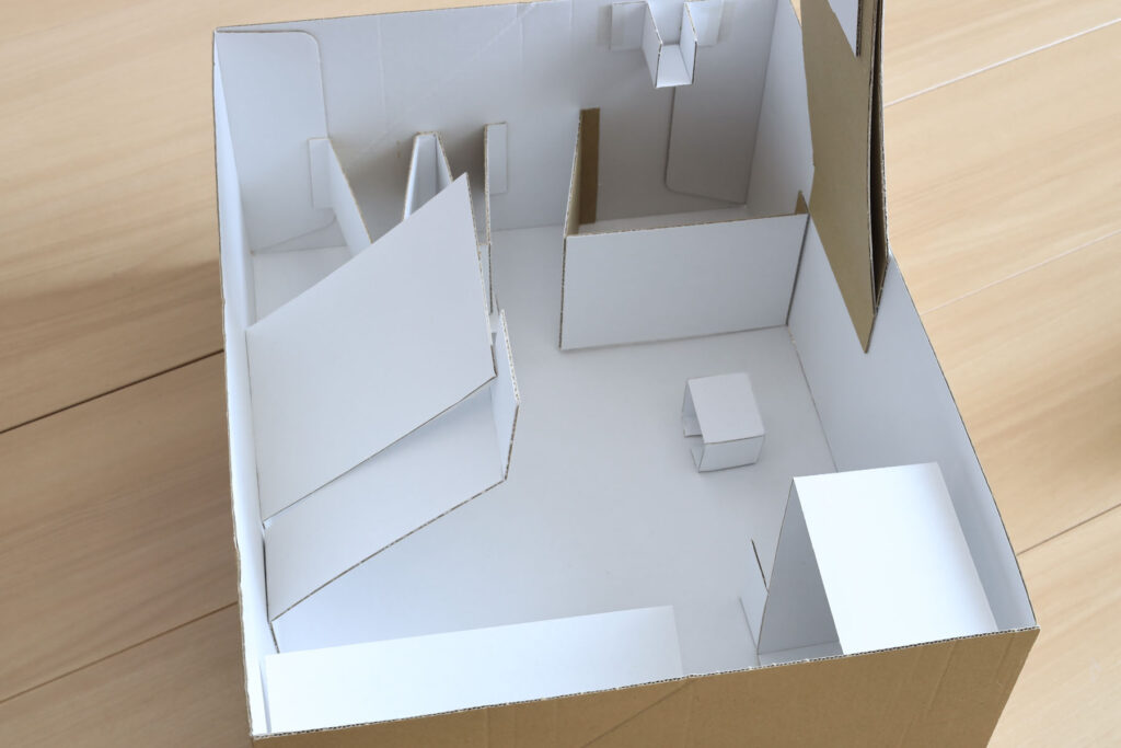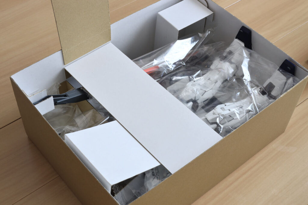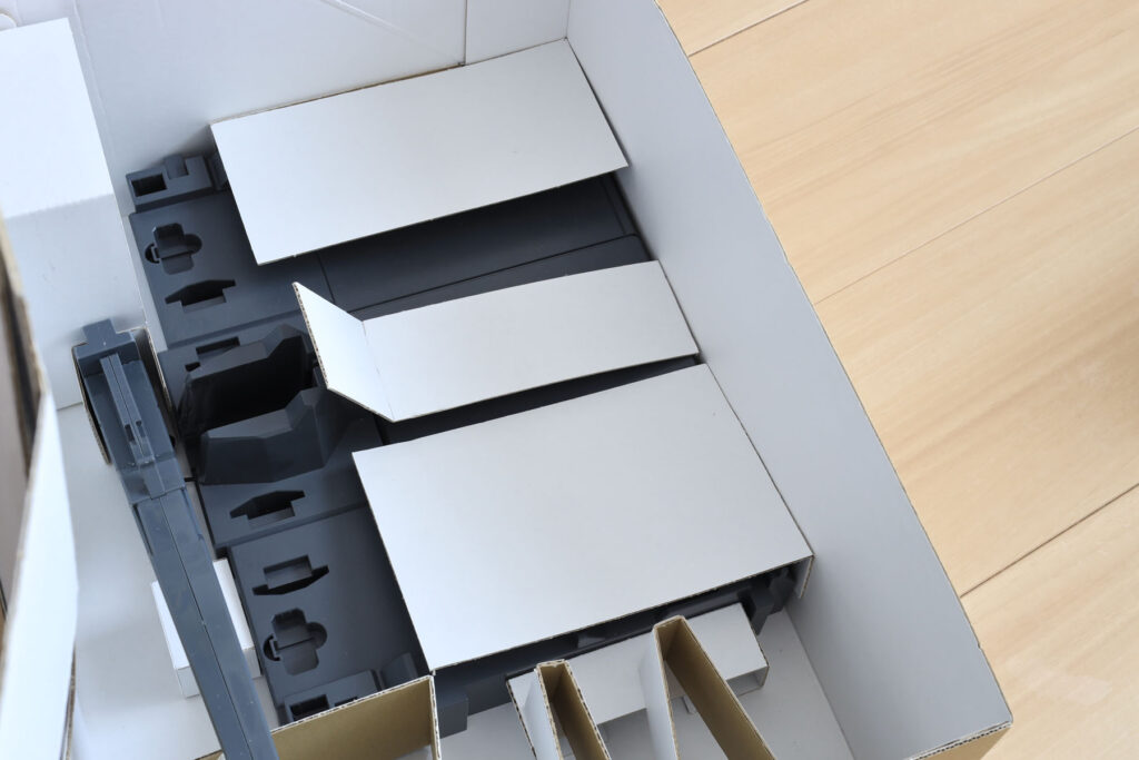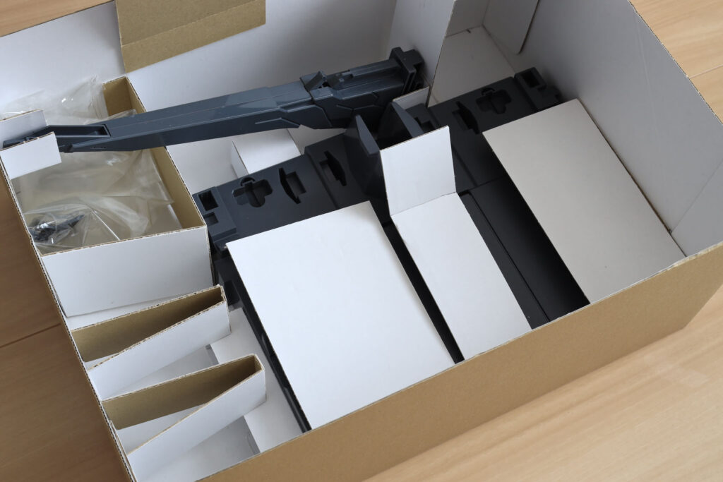 内箱。幅を外箱内寸より数ミリ小さくしているので、出し入れはスムーズです。パーツを梱包しているビニールや取説を噛まないように、押さえのパーツ(帯)をつけました。これらは内箱を小さくした際の余りの段ボールで作っています。