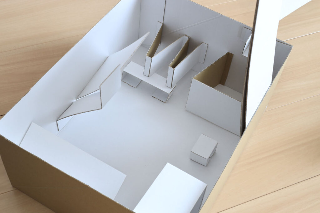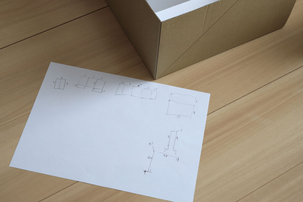 工作中の風景。右下にあるのがピザカッターです。寸法は成り行きで決めていますが、段ボールの厚みや、曲げ部の寸法なども考慮して決めます。内箱も同じ要領で1/2の大きさにしますが、外箱のりしろ部の厚みも考慮する必要があります。小さすぎるとガタが出ますし、ピッタリすぎると空気が入らず注射器のようになり、出し入れしにくくなります。