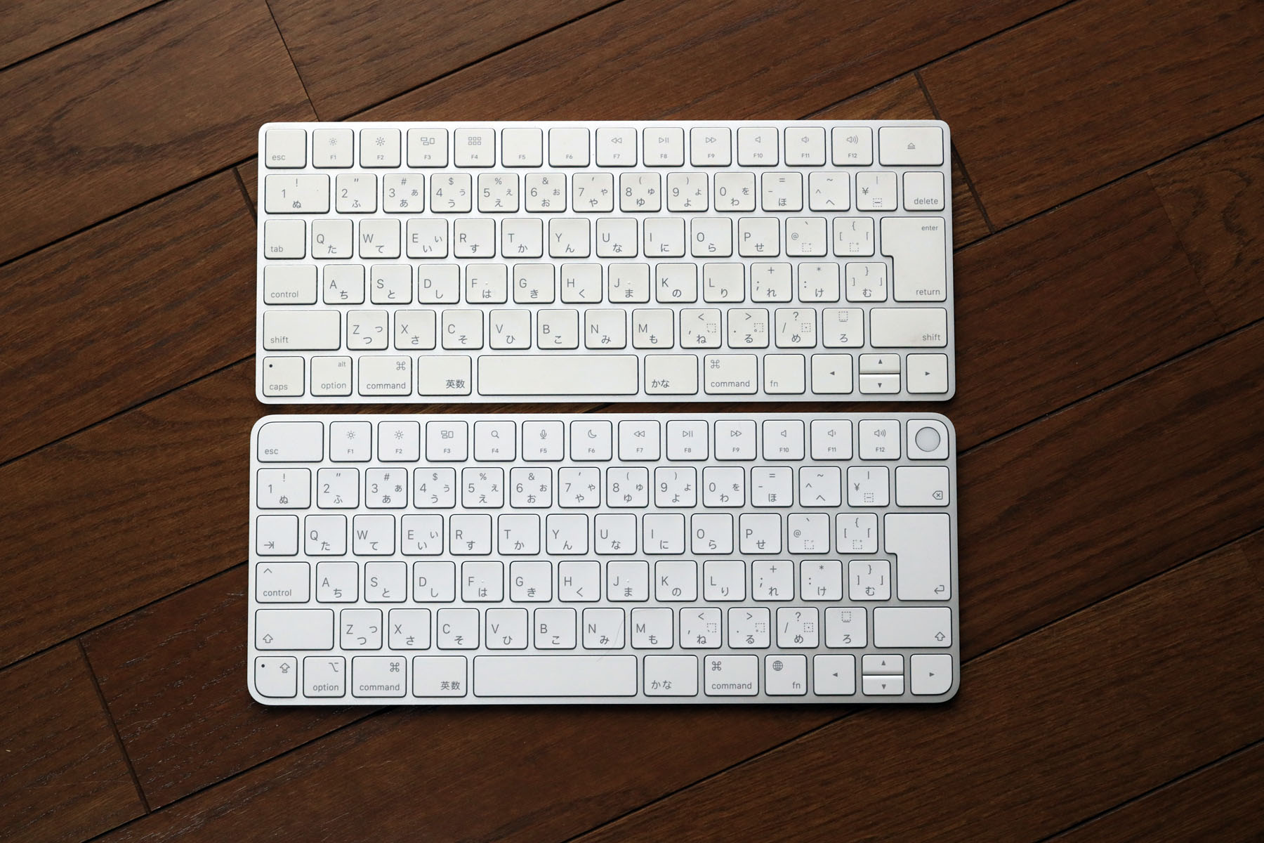 いままでのMagic Keyboardとの比較。これはいまiMac Late 2012で使っているものです。機能キーの割り当てや、筐体の角の丸みも違います。右カーソルやCaps Lockボタンを見て頂くと一目瞭然です。