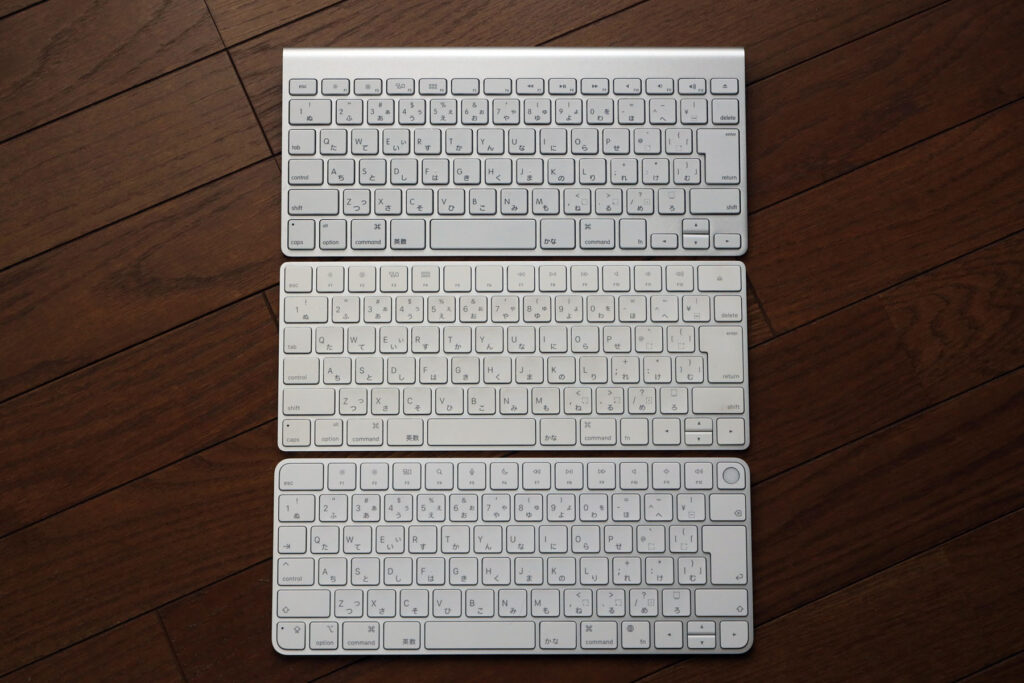 乾電池式Wireless Keyboard(一番上)との比較。この乾電池式Wireless Keyboardは単三電池2本タイプで2世代目。初代は単三電池3本だったように記憶しています。(iMac Late 2012付属のはそのタイプだったはず。)