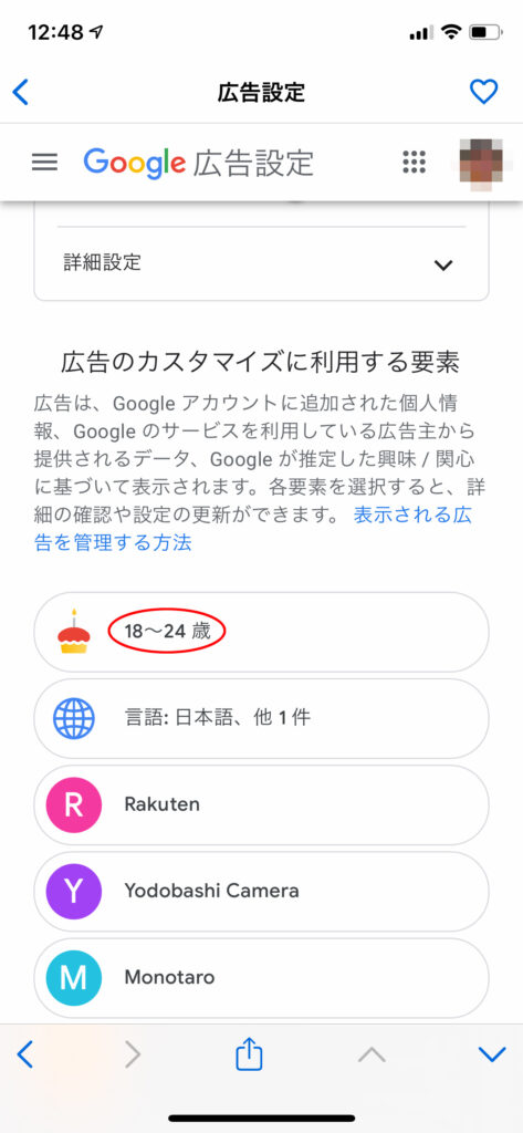 幸い、Googleの広告ならば、広告の右上に小さく出る「×」ボタンを押して広告設定画面に行けるので、そこで年齢を18〜24歳に変更してみました。(18歳以下だと未成年非対応コンテンツに影響があるような気がするので、この年齢にしました。)