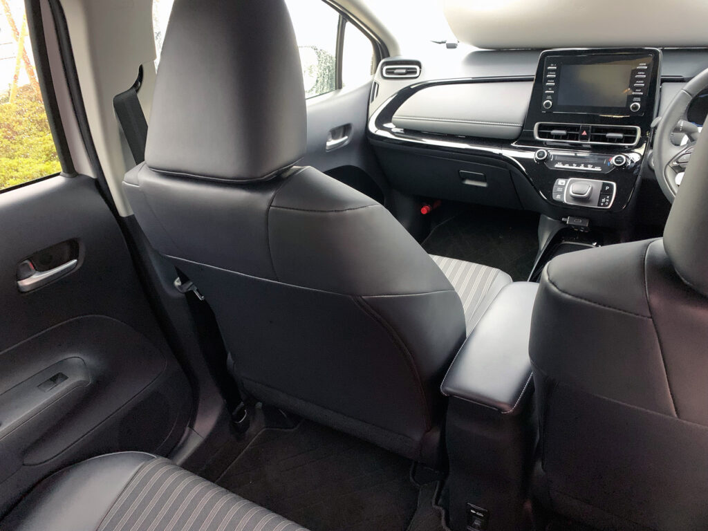 このお店ではよほど自信があるのか、「前席は一番後ろまで下げた状態です」で展示。そのまま後席に座りましたが、なんと私(身長184cm)の膝の前に余裕があります。新型AQUAのホイールベースは私が乗っていた8P型Audi A3と今乗っている8V型Audi A3のちょうど中間くらいなのですが、座席前後間隔で言えばこっちの方が広いぞ…。
