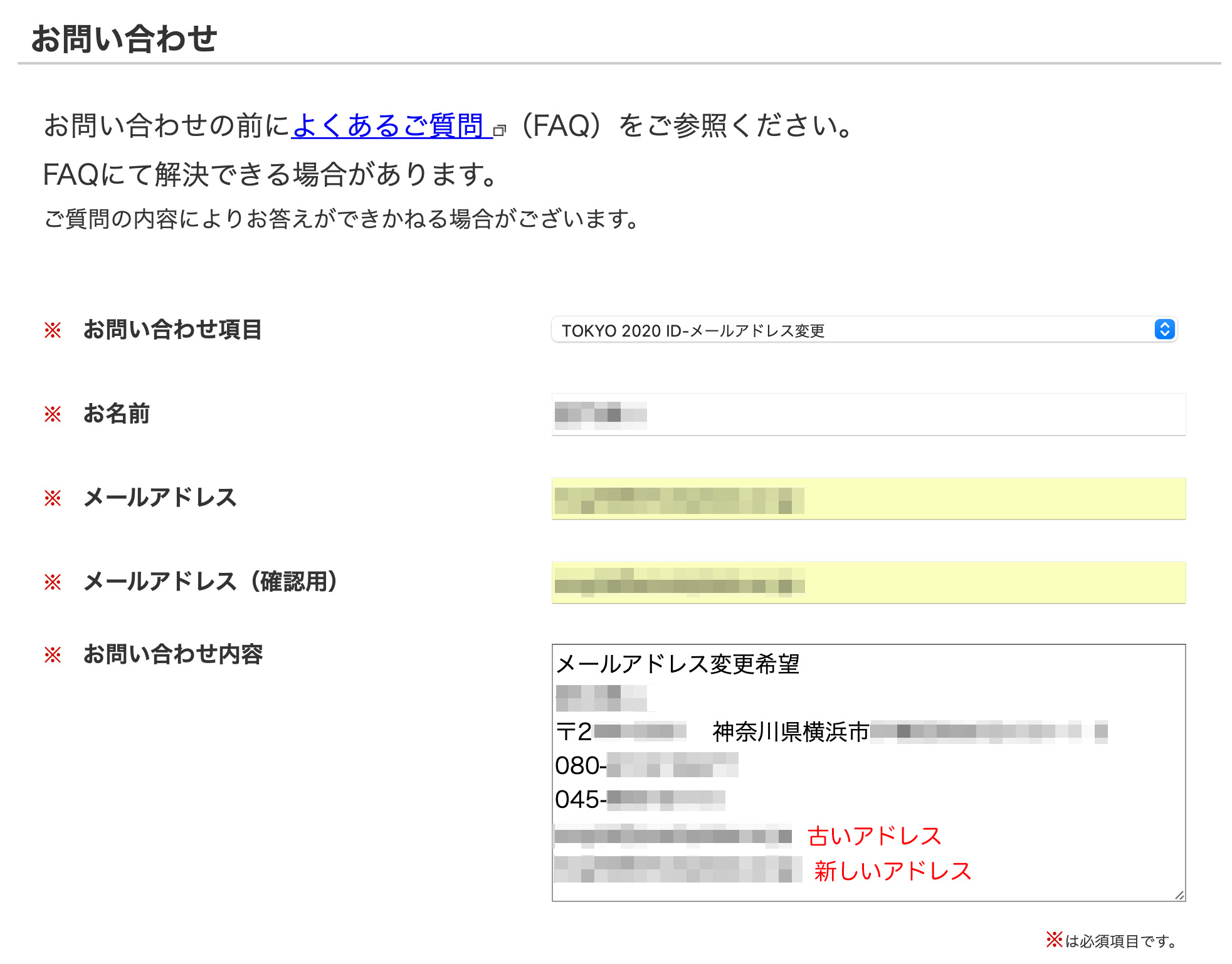 今度はコールセンターにTELにて相談することに。私が「そもそも、オリンピックのチケットはあとは返金だけだと思いますが、メールって受信できるようにする必要がありますか?」と尋ねたところ、「カード払い以外の方は返金方法を案内するメールを送りますし、カード払いの方ももし支払から今までの間にカードの有効期限の更新があった場合に手続きが必要なのでその案内を出すこともあります。よって、メールは受信できるようにしておいた方が良いです」とのこと。なるほど分かりました、ではメールアドレスの変更をしたいんですがと依頼したところ、「それはWebフォームから入れてください」と。いや、Webフォームがダメだったので電話したんですが!とツッコミを入れたところ、「実はこのように入力しないと受付されません」と指示されて記入したWebフォームは以下: