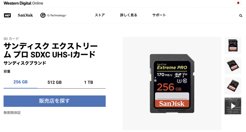 なお170MB/secモデルは日本には256GB以上しか正規では取り扱っていないので、それ以下の容量は並行輸入品になります。