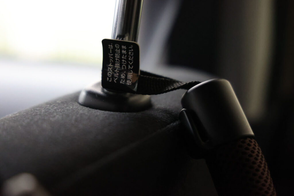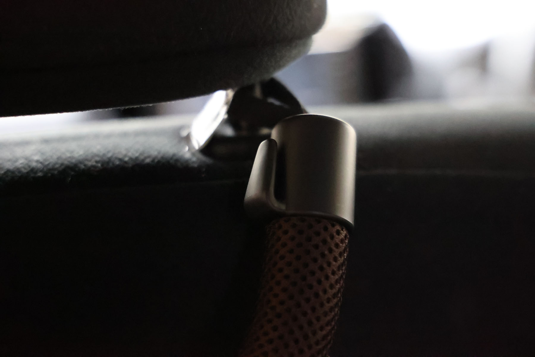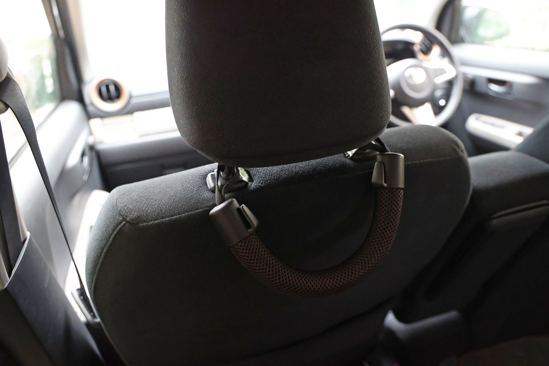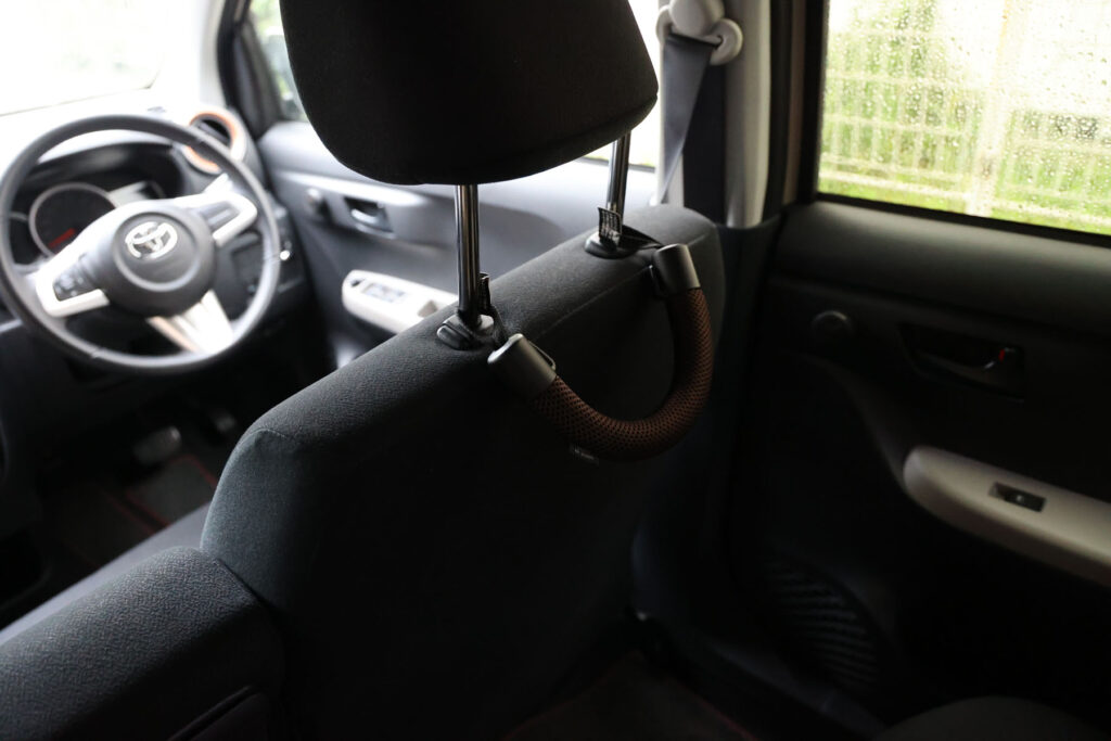 ヘッドレストの支柱にぶら下げるだけ。こう見えて、結構体重を掛けても大丈夫そうな感じです。色はブラックとブラウンがあったのですが、ブラウンにしてみました。