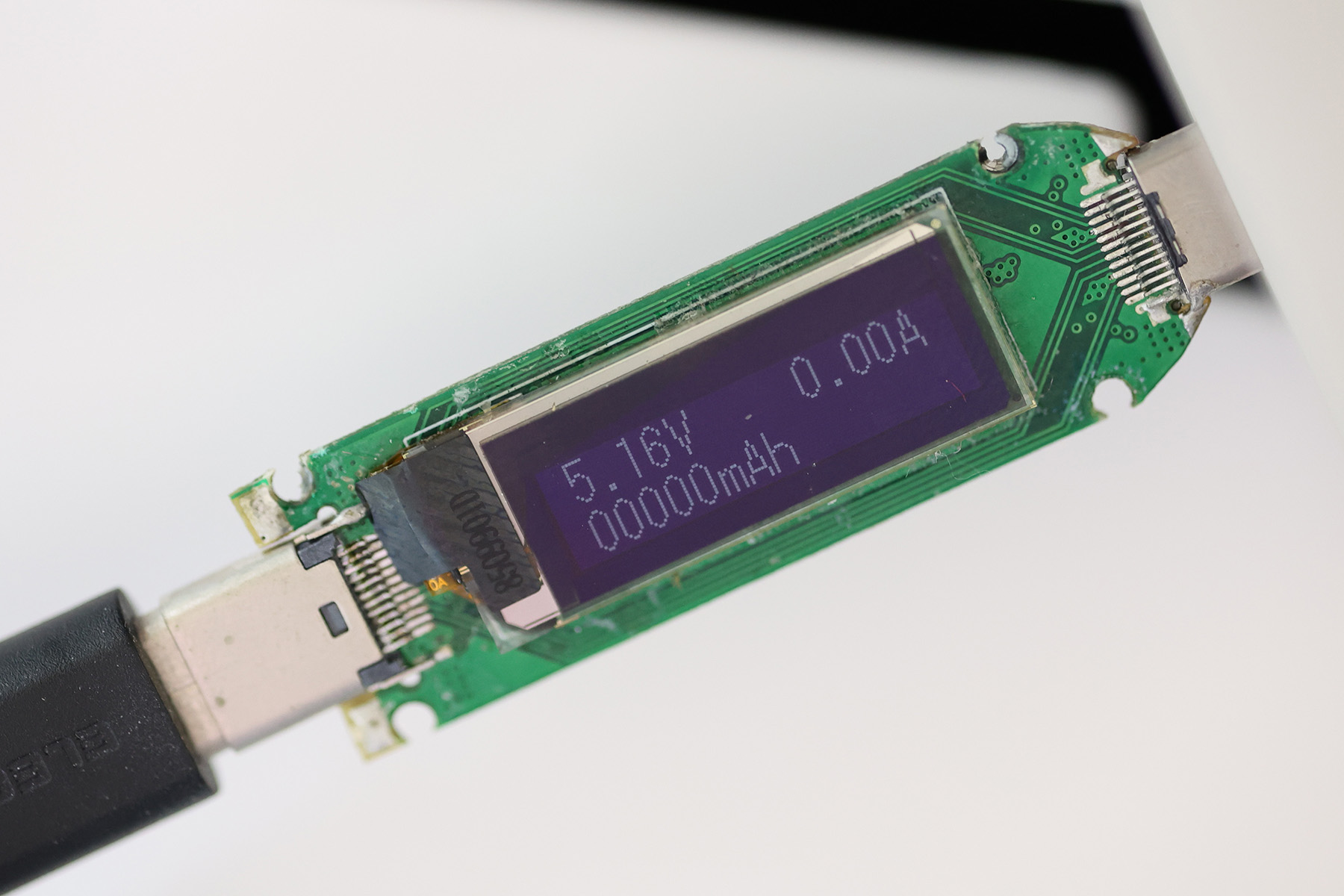 IC類は特に刻印などは判読できず、何のICかの手がかりをつかむことはできません。一番大きいICが表示用のドライバIC、左下の足が太めのICが電源? 上の対称に並んでいる2つのICが電流センス(双方向で2個)でしょうか? まぁでもこれくらいの規模の回路が入っていたら、USB3.1とか3.2の高速通信ができないのは想像できます。