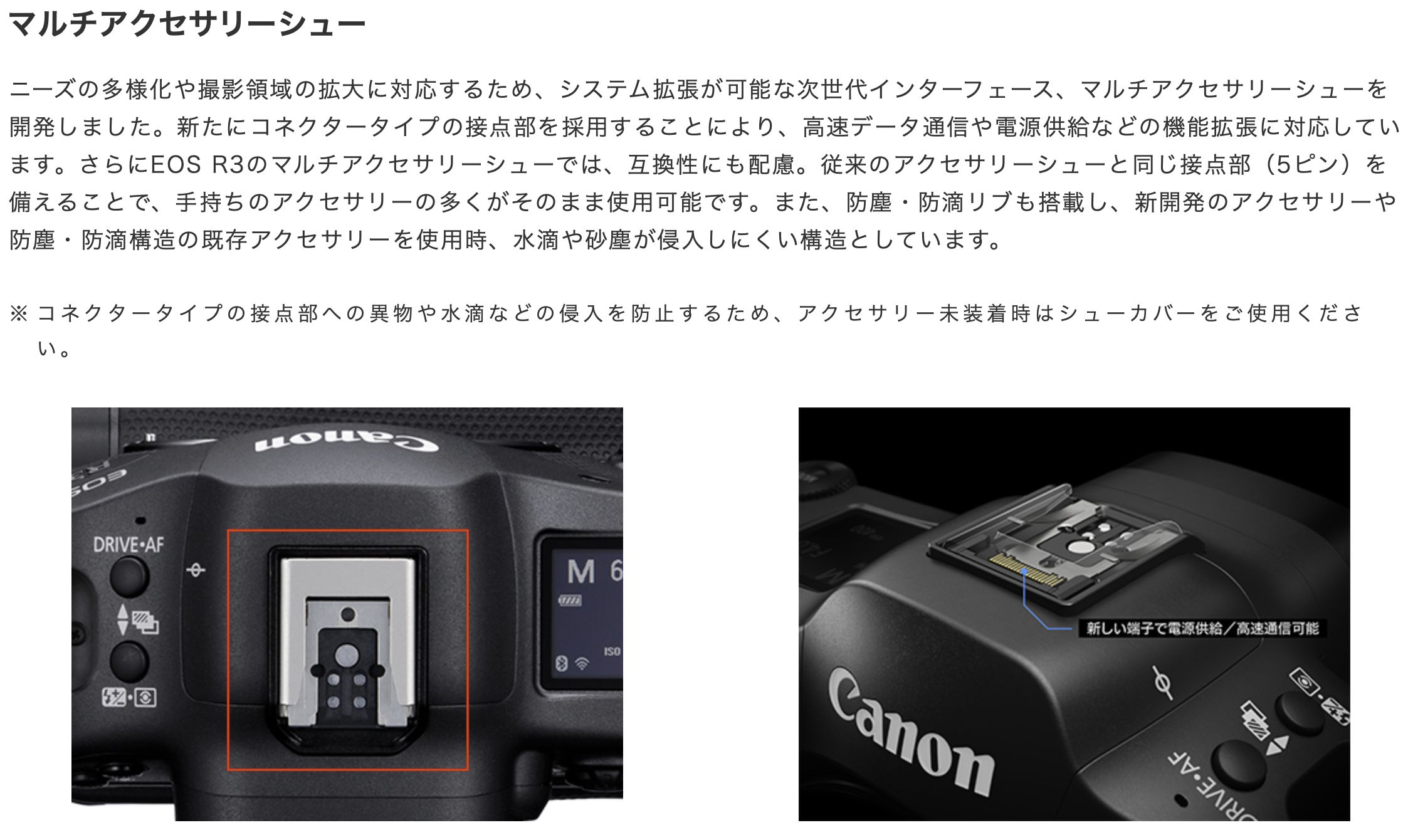 アクセサリーシューにソニーやキヤノンのビデオカメラで採用されていた「細かい端子」がつきました。なおシューカバーを付けないと防塵防滴性能はないそうです。