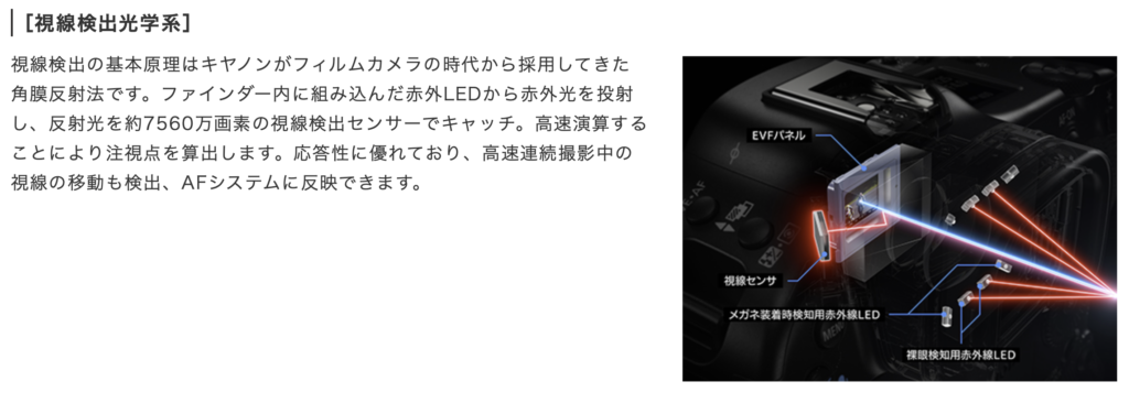 視線入力検知方式はなんと過去のものを踏襲! 視線検知でのAFフレームはほぼ無段階に動くようです。昔のEOSの方式を踏襲していてそこまでできるのか。
