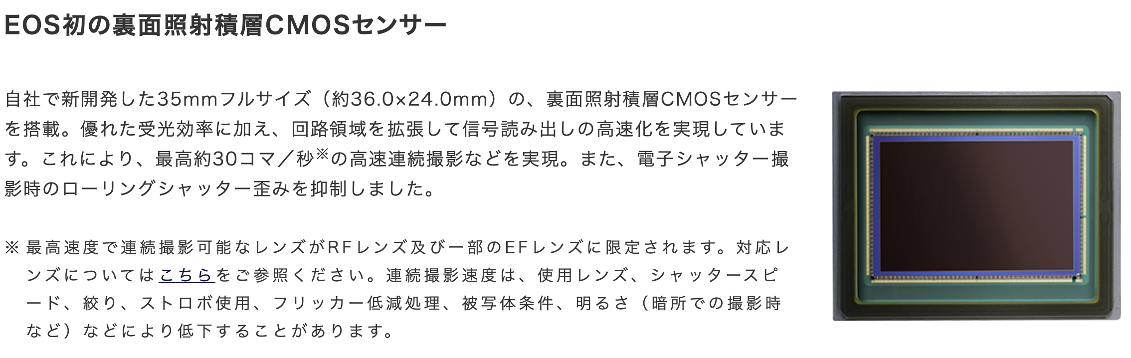 頑なにスペックが示されなかったセンサーはEOS初の裏面照射で2,420万画素。意外なほど画素が少ない印象がありますが、これは速写性とのバランスを取った結果でしょう。そして驚くのが、