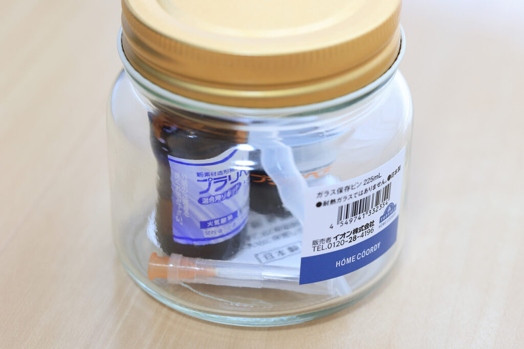 では何に密閉しておこう…と考えた場合、プラリペア自体が小瓶に入れてパッケージされていたことから、まぁ瓶だろうと。百均に買いに行ったのですが、百均、以前は瓶が売っていたと思うのですが、今や瓶に似せたPETボトルしか売っていません。仕方なく百均ではなくショッピングモールで瓶を買ってきました。213円くらいだったかな。あまりコストを掛けるとプラリペアを都度買った方が安くなってしまうので程々に。