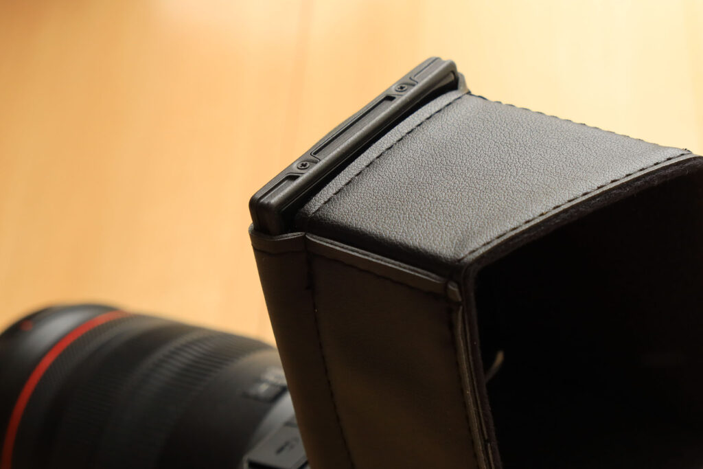 EOS R6のパネル部材よりはやや小さいサイズですが、表示領域に対しては実にピッタリサイズ。この製品は2サイズ展開で、購入したのは小さい方。これが大きい方の3.0-3.5インチ用の CMD-MH-01V35 だと、EOS R6ではパネル部部材に対して少しはみ出してしまうので、覗いた際に液晶左側から光が入ってしまうようです。