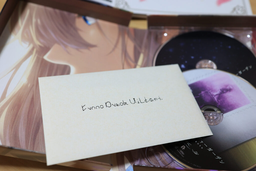 ギルベルト少佐への最後の手紙入り…なんか、見てはいけないようなものを見てしまった気がします。手紙はテルシス語と日本語の2枚が入っていますので、解読の必要はありません。内容は基本的にラストシーンで少佐が手にしていてヴァイオレットの声で朗読されるものですが、テルシス語で本編の画面には映るもののセリフとして読み上げられない「最後の一行」が存在することが分かります。