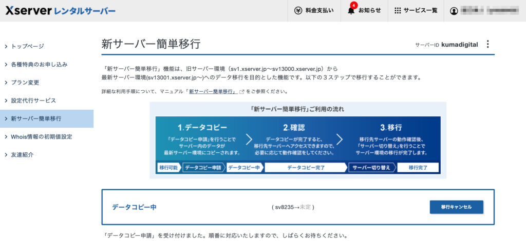 申し込みの9分後にはコピー開始、そこから57分でコピー完了。コピー完了のメールを受信後に移行先の環境での動作確認をしたら、「サーバー切り替え」ボタンを押すだけ。一番難しいのが動作確認時の自分のパソコンのhostsファイルの一時書き換えくらいです。メールサーバーは使っていないので、そこの移行の面倒くささはありませんでした。