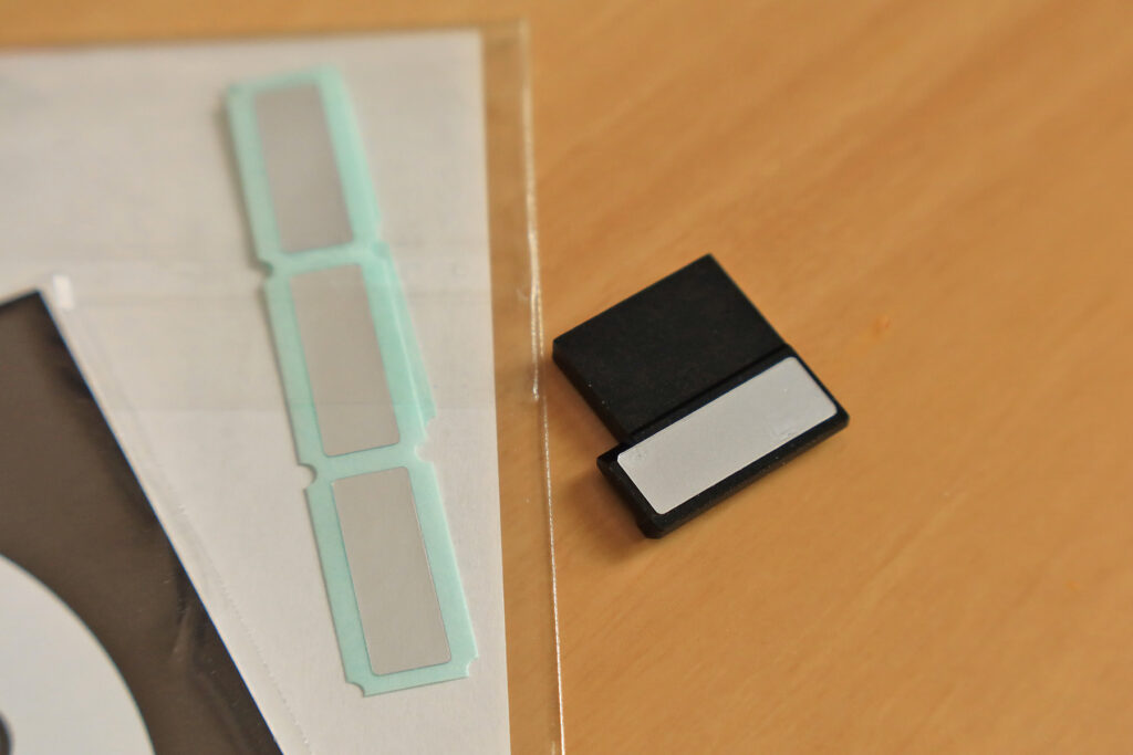 金属製なので素材の「粘り」はあまりありませんので、付属の金属調シールを裏面に適宜枚数貼って装着時の固さを調整します。1枚あたり0.08mmだそうです。私は2枚貼ってちょうど良かったです。