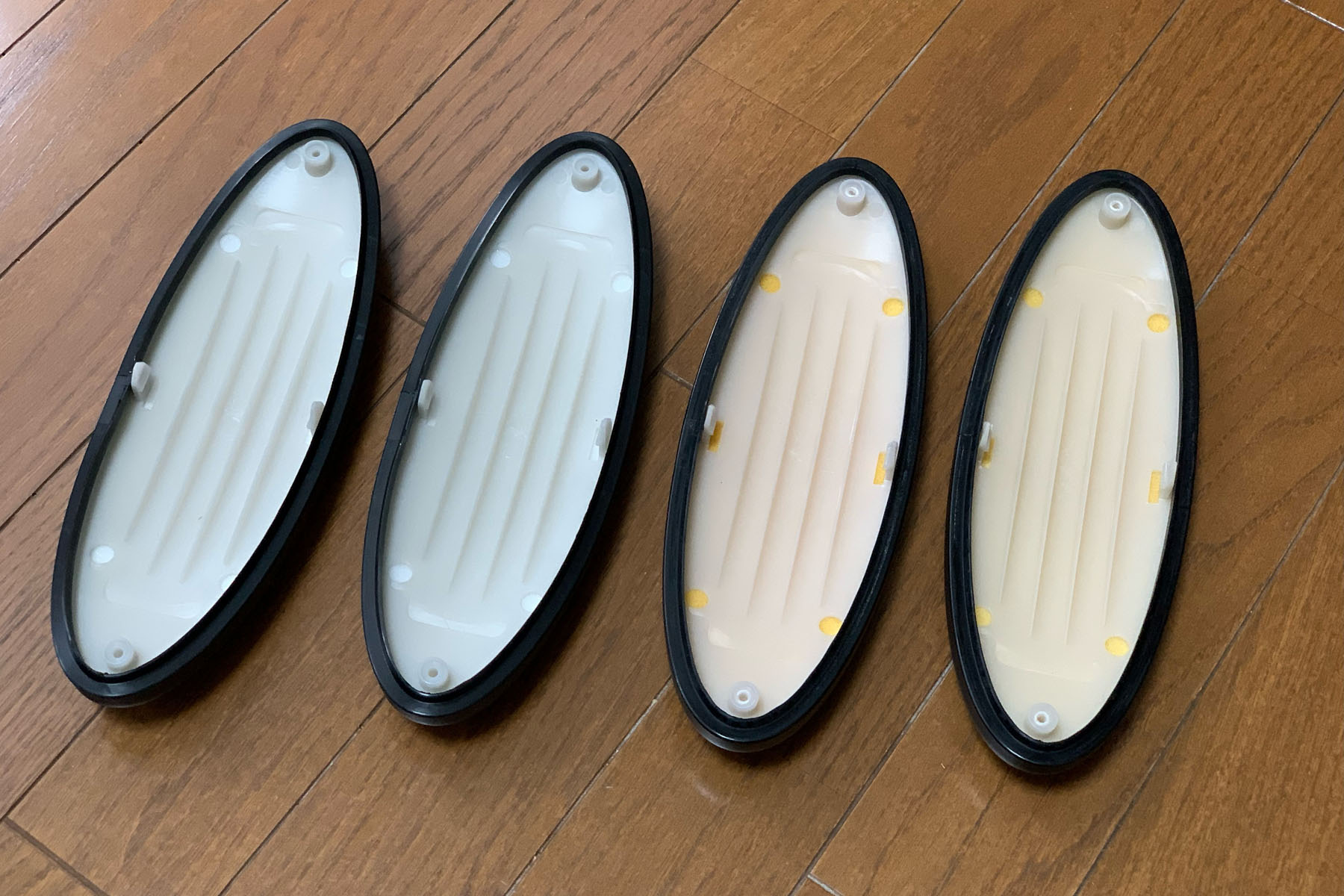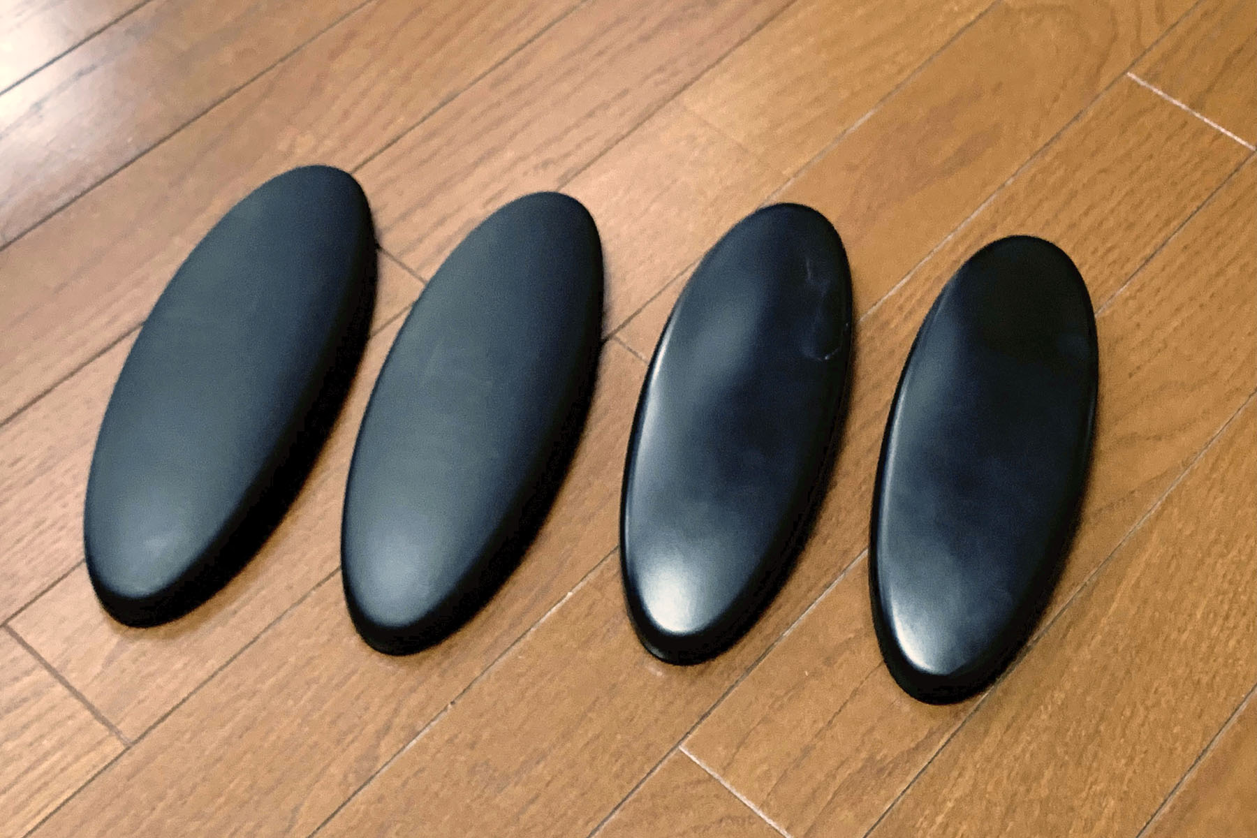 ITOKIに問い合わせたところ、肘パット部分だけ購入できるとのことなので、すかさず購入。受注生産で納期3週間かかりますが、まぁOK。左2個が届いたパーツです。BtoB向け販売チャネルだったのか、送られてきた部品に「受領証」と「切手付き返信用封筒」まで同梱されていたのには驚きました。