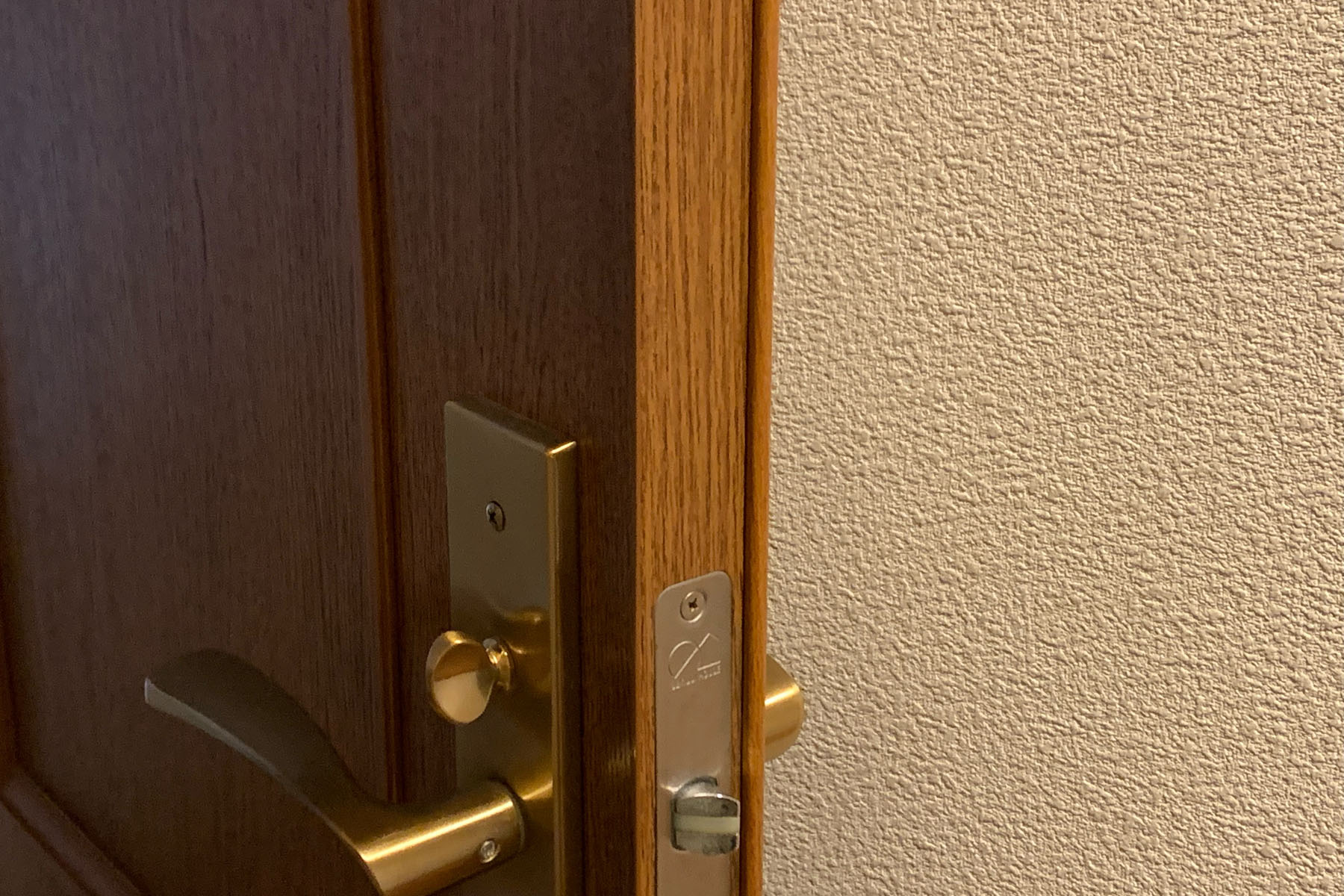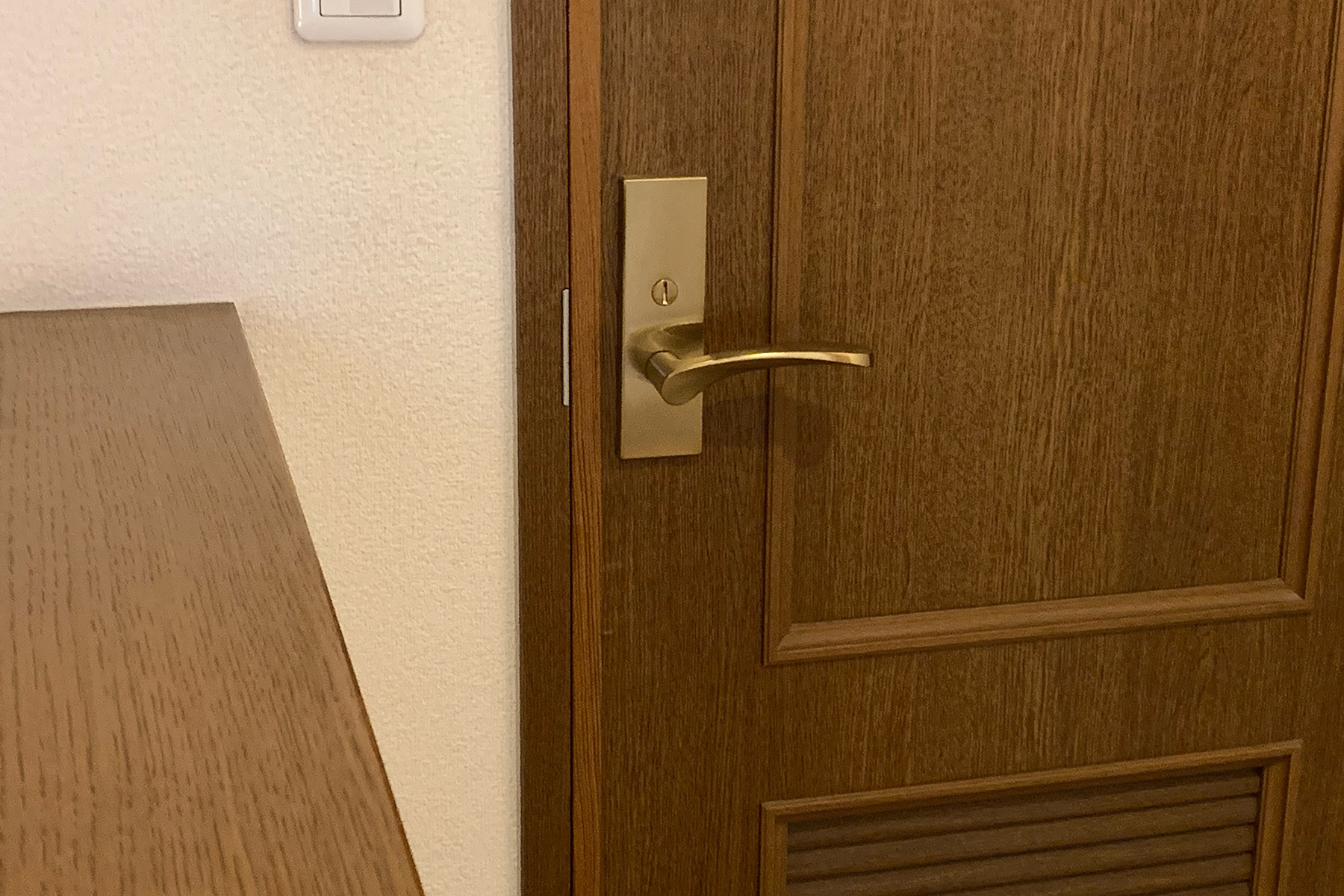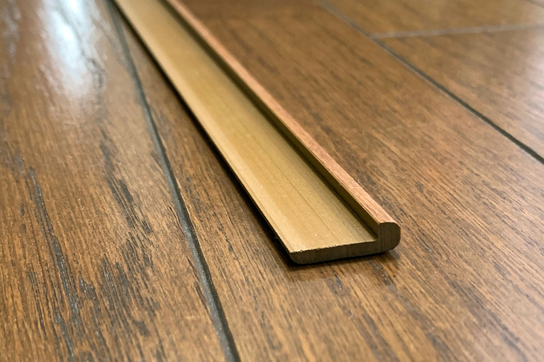 長さを扉に合わせて細目ノコギリで切断し、両面テープで貼って完成。ドアと枠の隙間は6mmくらいあり、そこに4mmはみ出すモールを付けた格好です。ドアと枠の隙間が狭いとこの部材は貼り付けられないですね。ホームセンターの既製品で色を完全に合わせるのは難しいので、違和感がなくて好みの木目のものを選んできました。浮いたフィルムを完全にはカバーできていませんが、端部を抑えたのでこれ以上被害拡大することはないはずです。